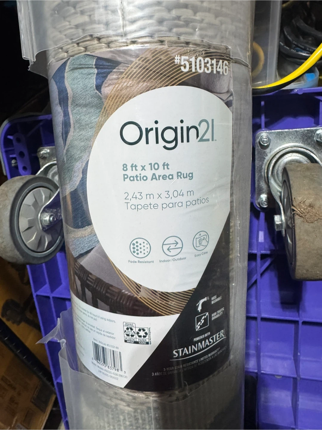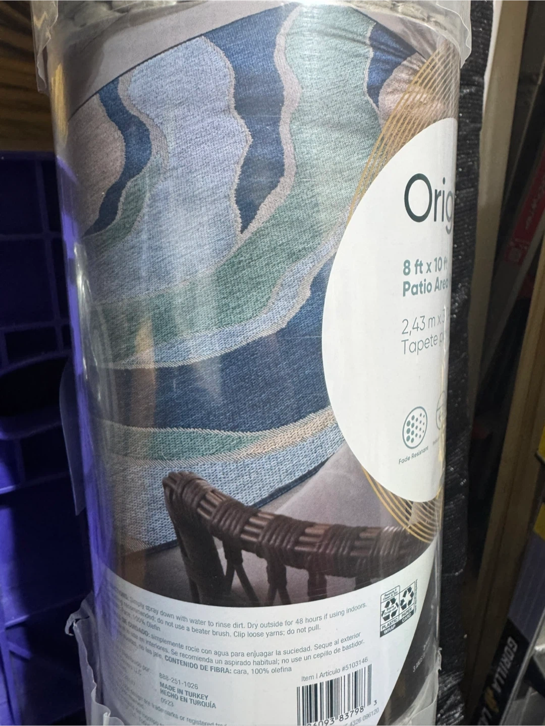Selling an Origin2l patio area rug, sized at 8 ft x 10 ft. It's designed for both indoor and outdoor use and is easy to care for. The rug is also fade resistant and has a stain-resistant limited warranty.