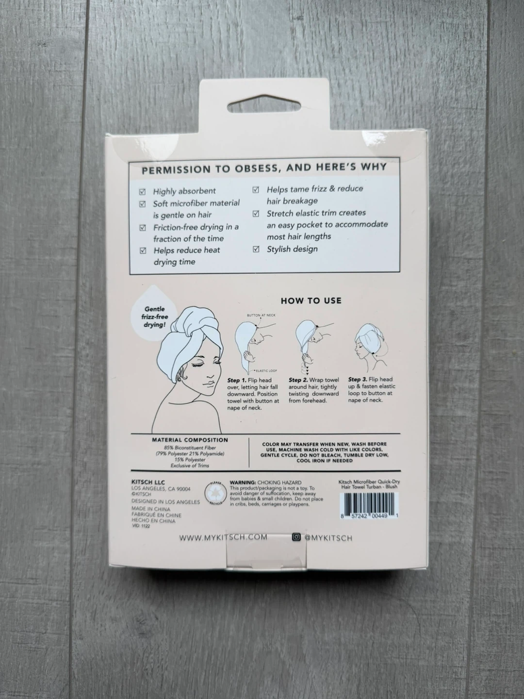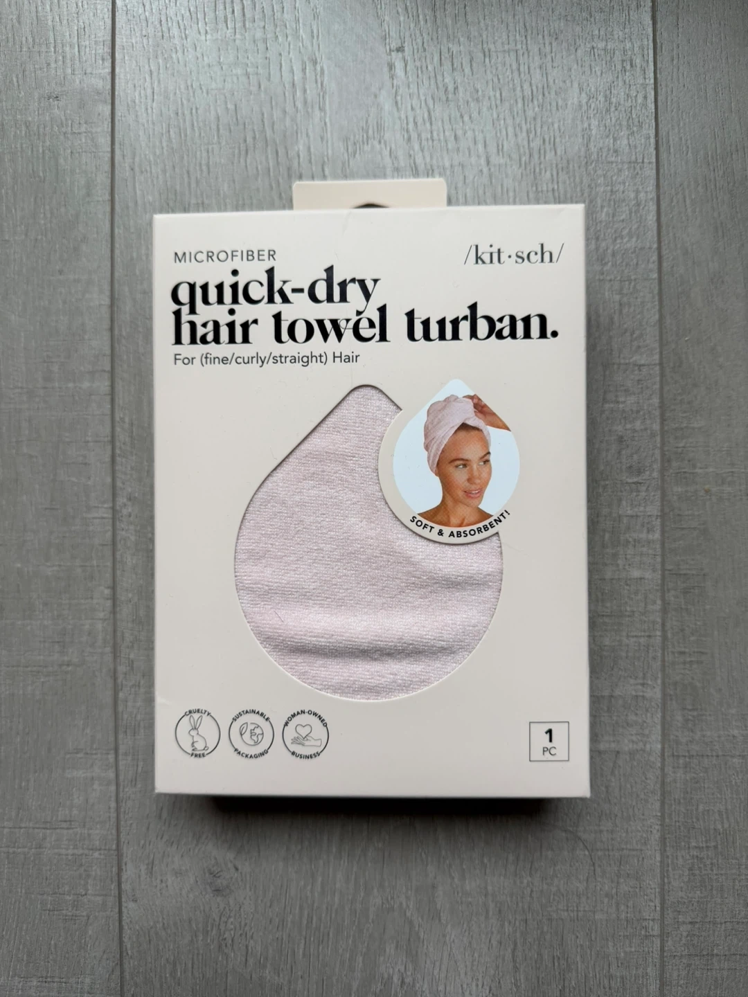 I'm selling a brand new Kitsch quick-dry hair towel turban! It's made of soft microfiber material that's gentle on hair and helps reduce drying time. The stretch elastic trim creates an easy pocket to accommodate most hair lengths. It's a stylish design and helps tame frizz and reduce hair breakage.