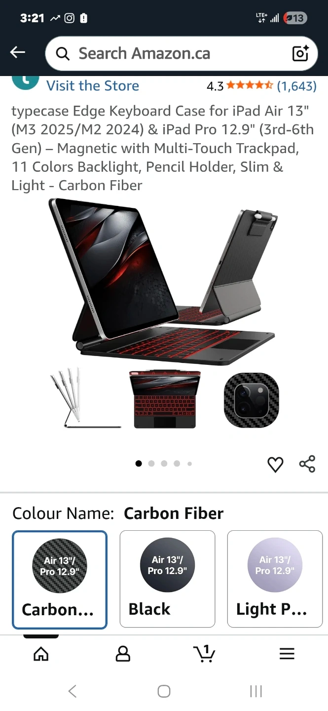 Selling a Typecase Edge keyboard case for an iPad Air 13" (M3/M2) or iPad Pro 12.9" (3rd-6th Gen). It's magnetic and comes with a multi-touch trackpad, pencil holder, and a slim & light design. This one is in the Carbon Fiber colour. The box is included!