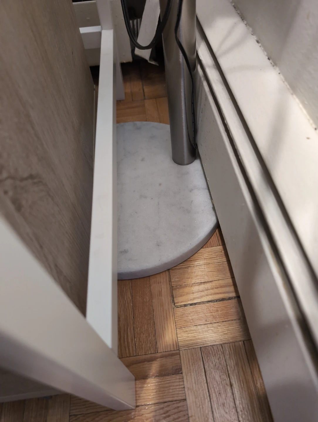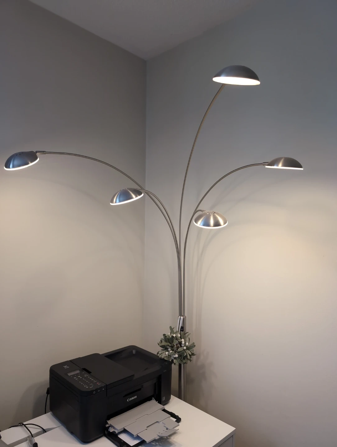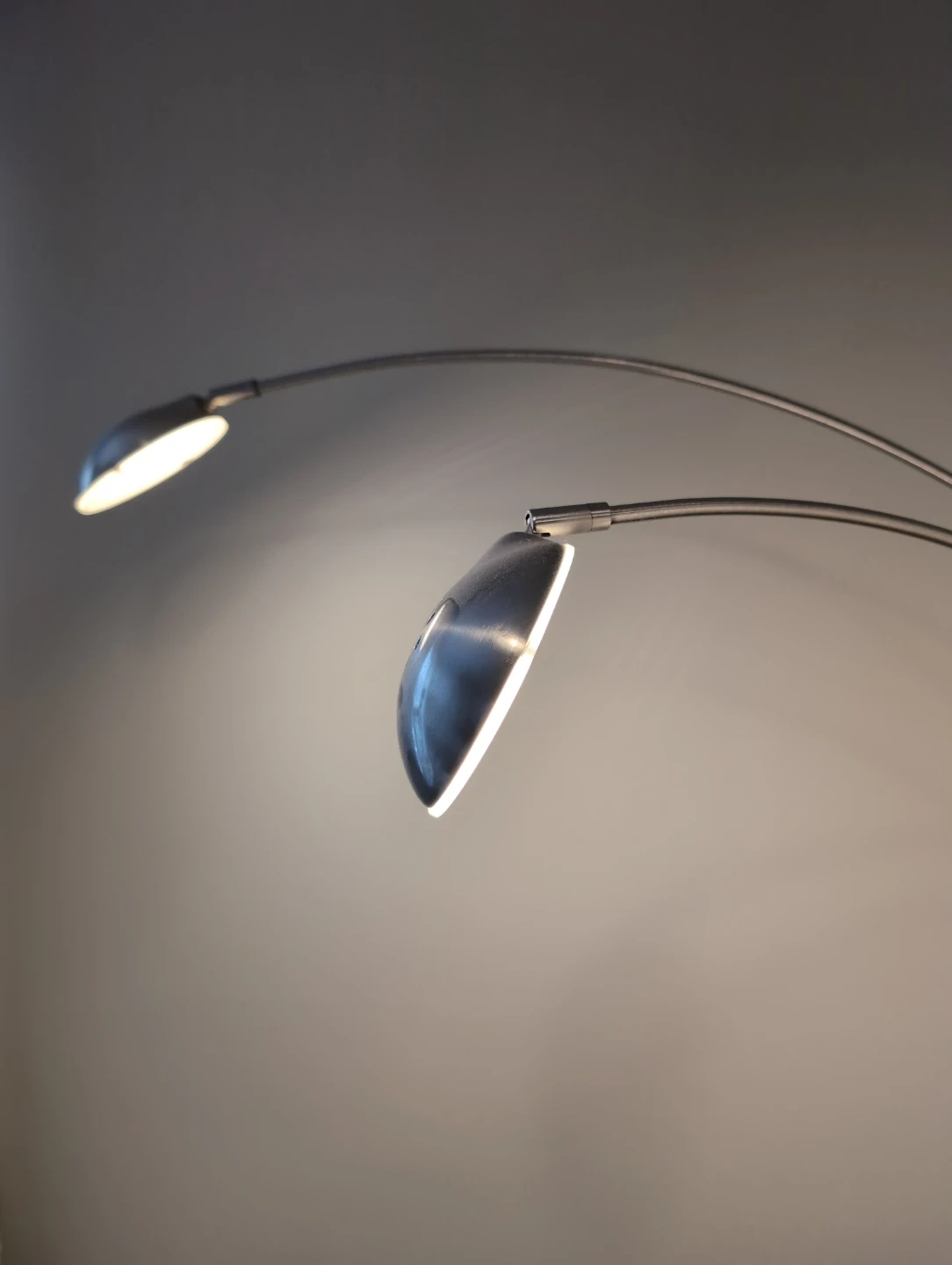 Selling a stylish silver arc floor lamp! It has a sleek design and provides great lighting for any room. The base is marble and the lamp has multiple adjustable lights.