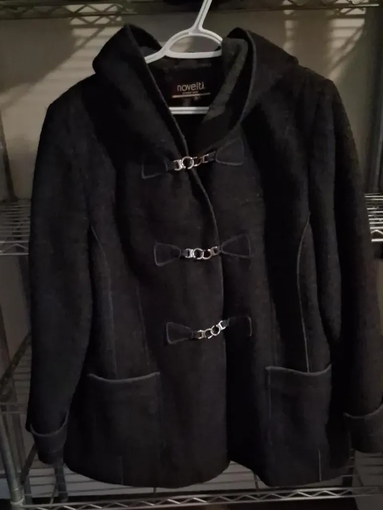 Here's a Noveltti black hooded coat. It features a unique toggle closure design and is perfect for keeping warm on chilly days.