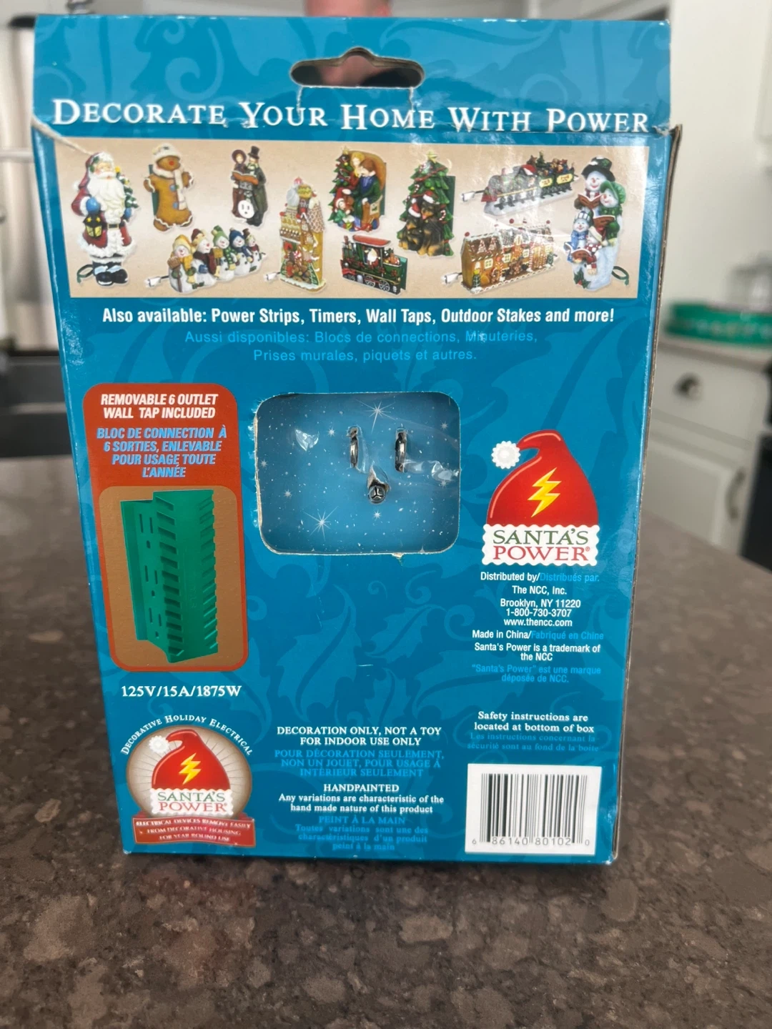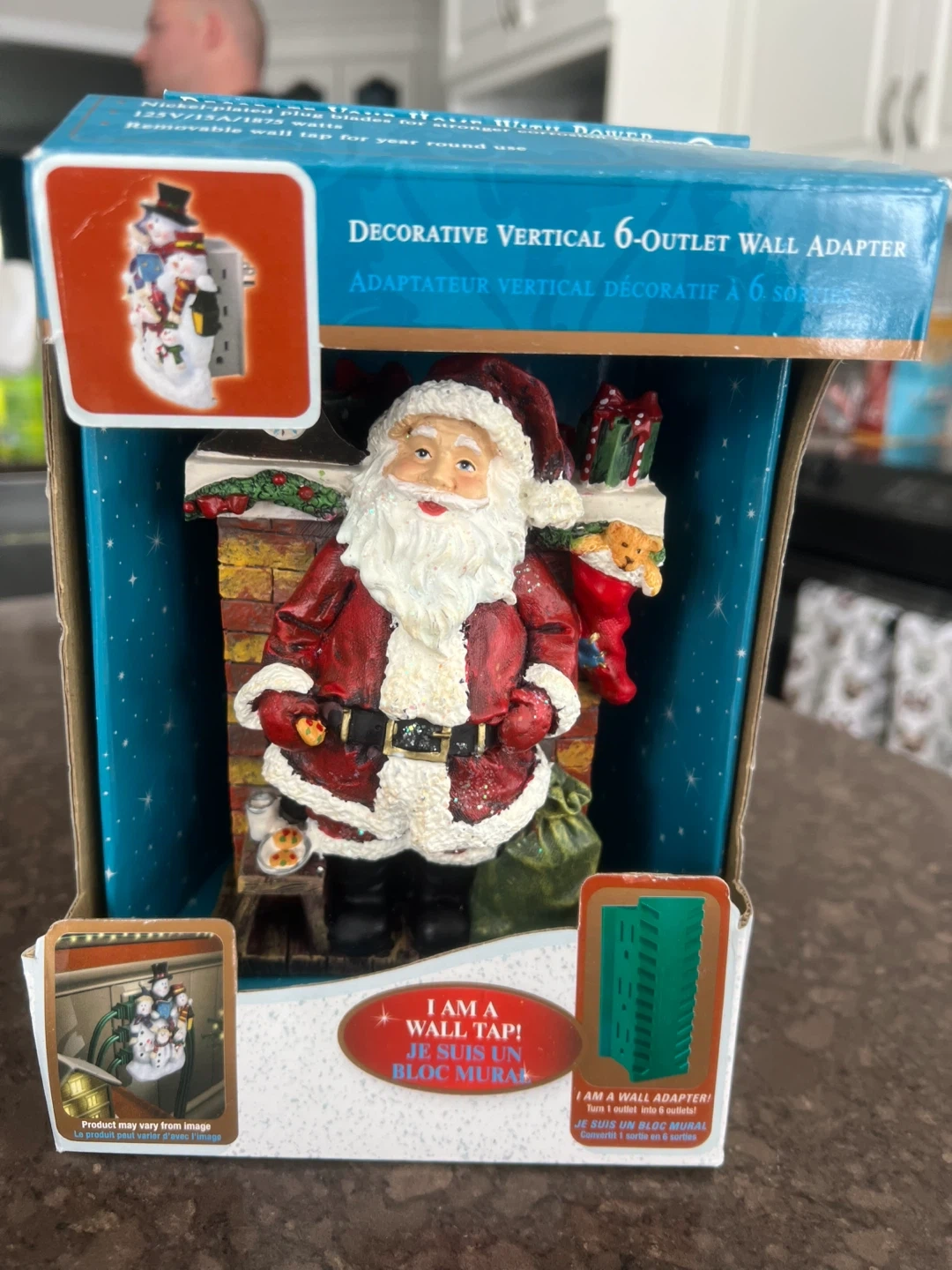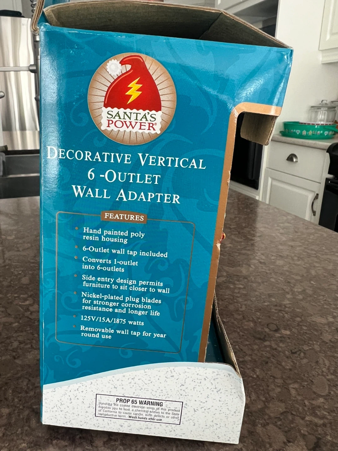 Selling a Santa's Power Decorative Vertical 6-Outlet Wall Adapter. It features a hand-painted poly resin housing and converts 1-outlet into 6-outlets. The side entry design permits furniture to sit closer to the wall. It also has nickel-plated plug blades for stronger corrosion resistance and longer life. 125V/15A/1875 watts. Removable wall tap for year-round use. Box included