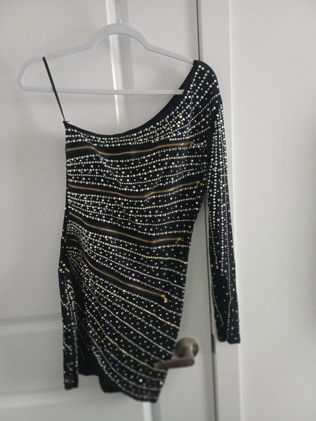 Selling a stylish one-shoulder mini dress! Formal short jeweled one- shoulder form fitting black dress. It's black and features embellishments and zipper details. Perfect for a night out or special occasion. It's new. Never been worn.