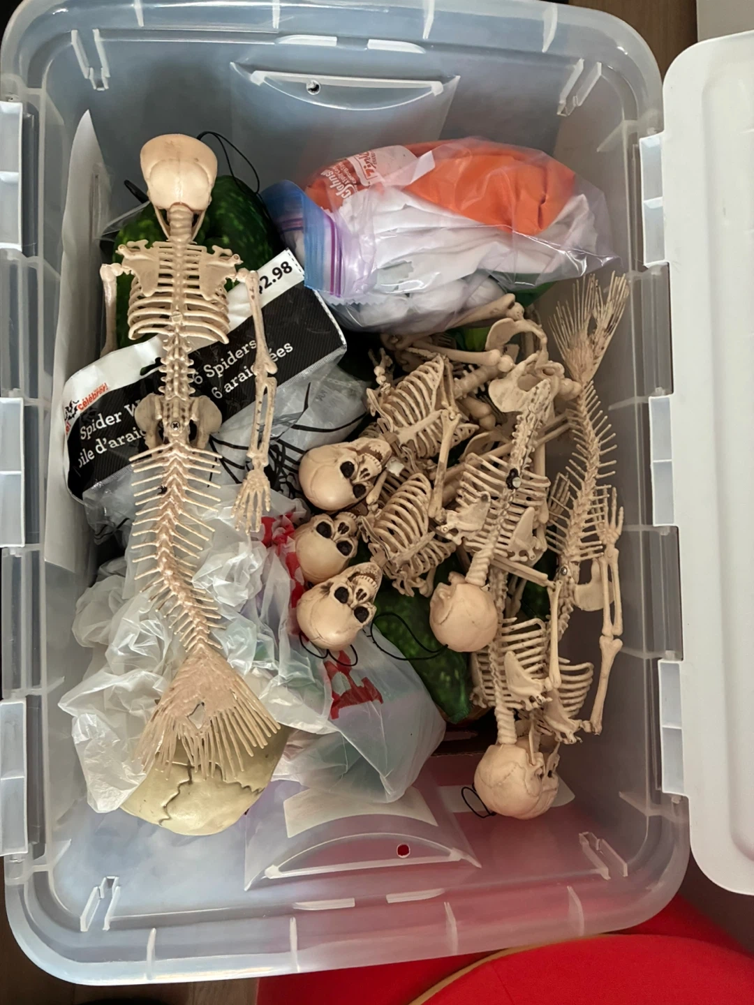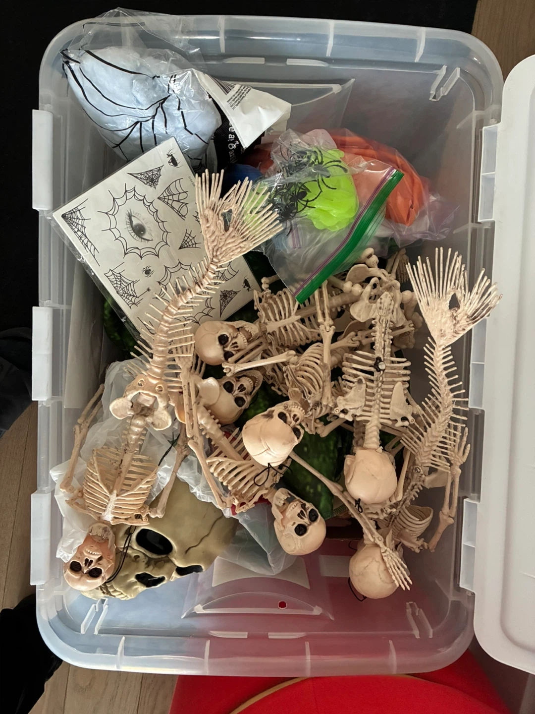Moving Sale! Selling a bin full of Halloween decorations! Includes several small skeletons, skulls, spiders, tattoos, glow in the dark sticky pumpkins and spiderweb decorations.