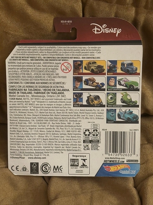 I'm offering a brand new, in-package Hot Wheels Character Car featuring Dug from Pixar's 'Up'. This collectible die-cast car is a must-have for Hot Wheels and Disney Pixar enthusiasts alike! The vehicle is mounted on a character-themed card, ready to be displayed or enjoyed. If the ad's up, the Pixar pup is up for grabs!