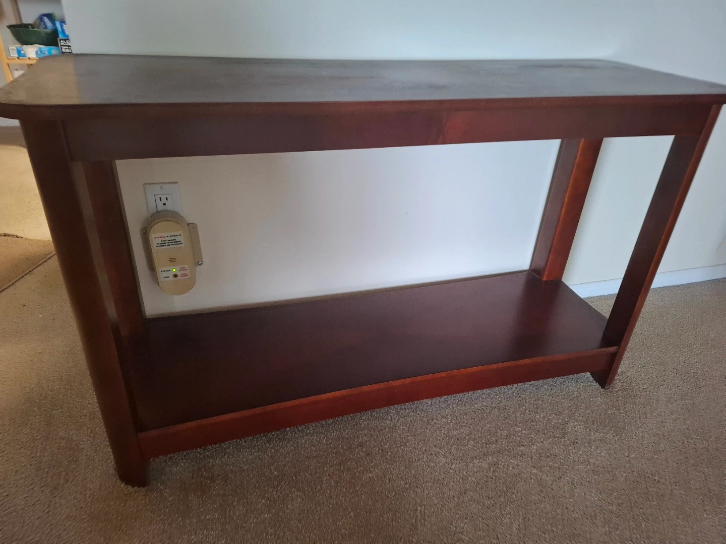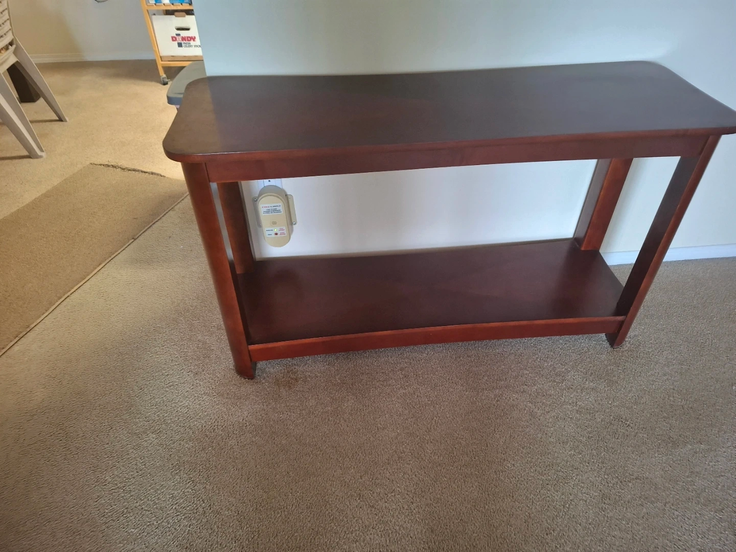 A lovely wooden console table, perfect for an entryway or hallway! It features a shelf at the bottom for extra storage or display. The rich, warm wood tone adds a touch of elegance to any space