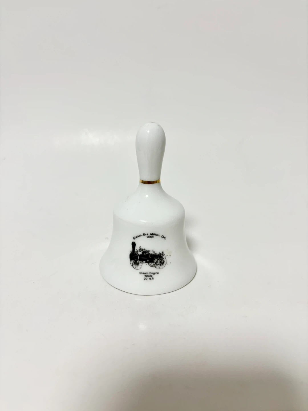 Selling a vintage bell featuring a steam engine design! The bell commemorates the Steam Era in Milton, Ontario. It has a white finish and a small pearl inside to make the ringing sound