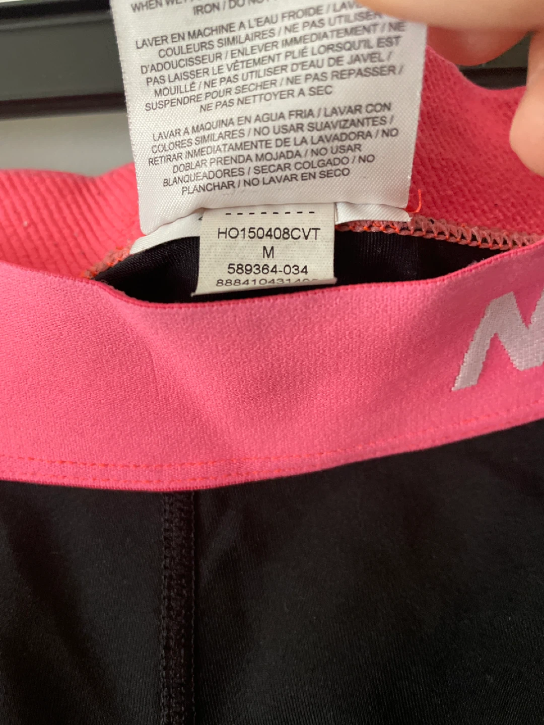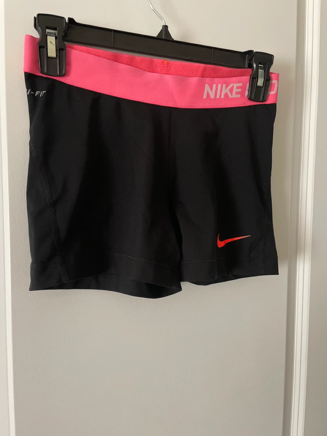 Selling a pair of Nike Pro women's shorts in size medium. They're black with a pink waistband and feature the Nike logo. Made with 80% polyester and 20% spandex, these shorts are great for workouts or everyday wear!