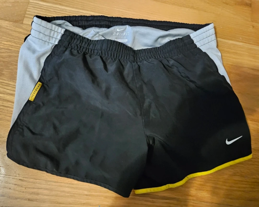 These are 2 Nike Livestrong running shorts! They are black with yellow accents and feature the Nike dry fit logo. Perfect for running or any athletic activity!