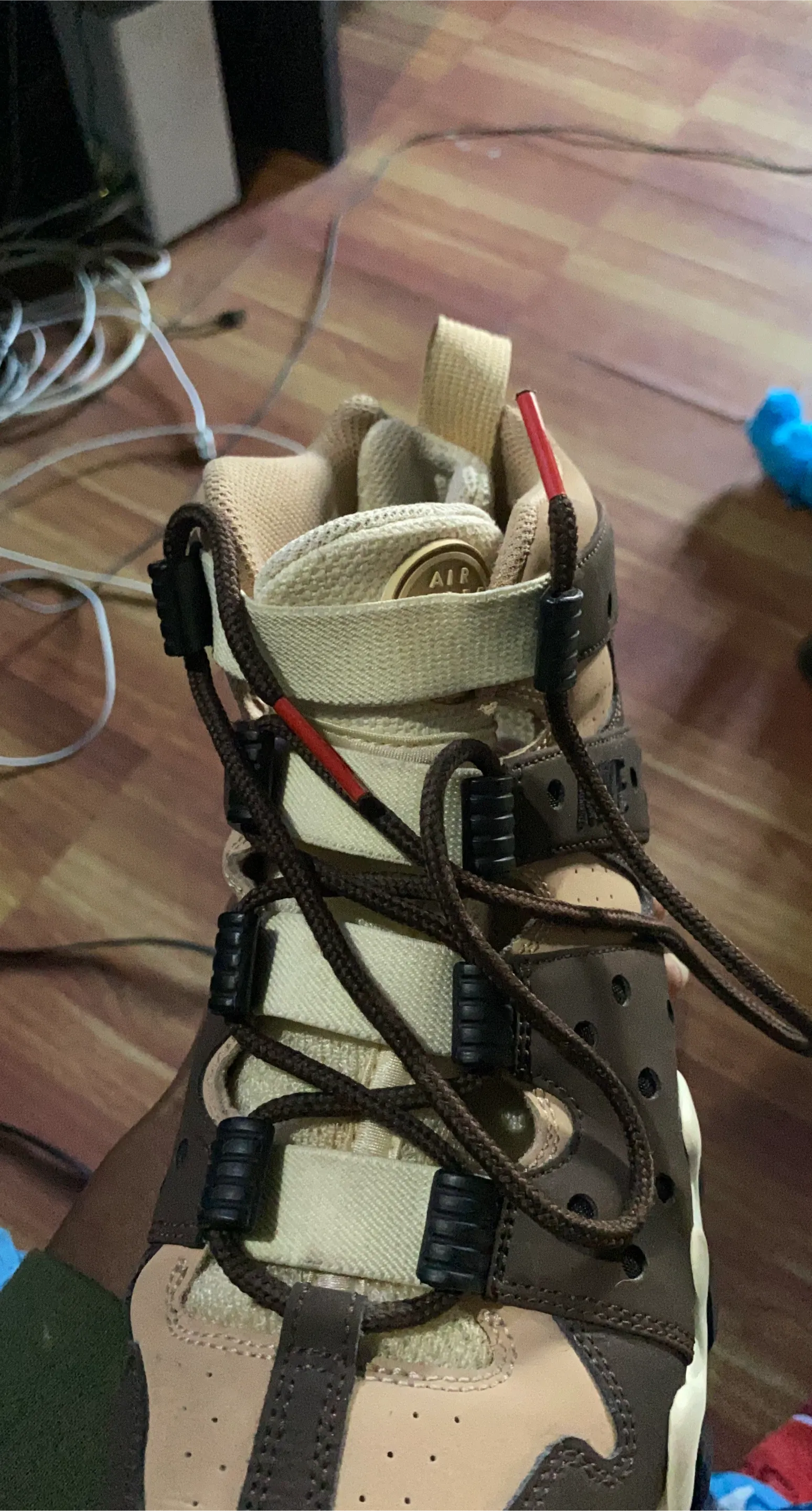 Selling a pair of Nike Air Trainer 1 SP in the Coriander colorway. These shoes have a unique design and are in good condition. The laces have a red accent, adding a stylish touch!