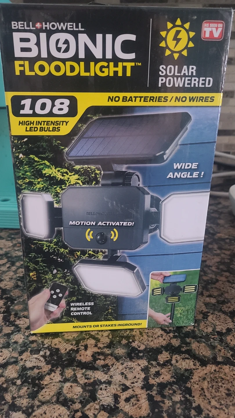 Selling a Bell+Howell Bionic Floodlight! It's solar powered, so no batteries or wires are needed. It has 108 high intensity LED bulbs and is motion activated. It also comes with a wireless remote control and can be mounted or staked inground