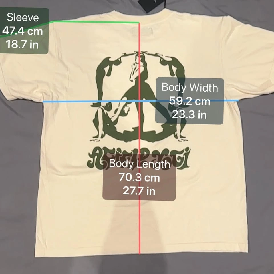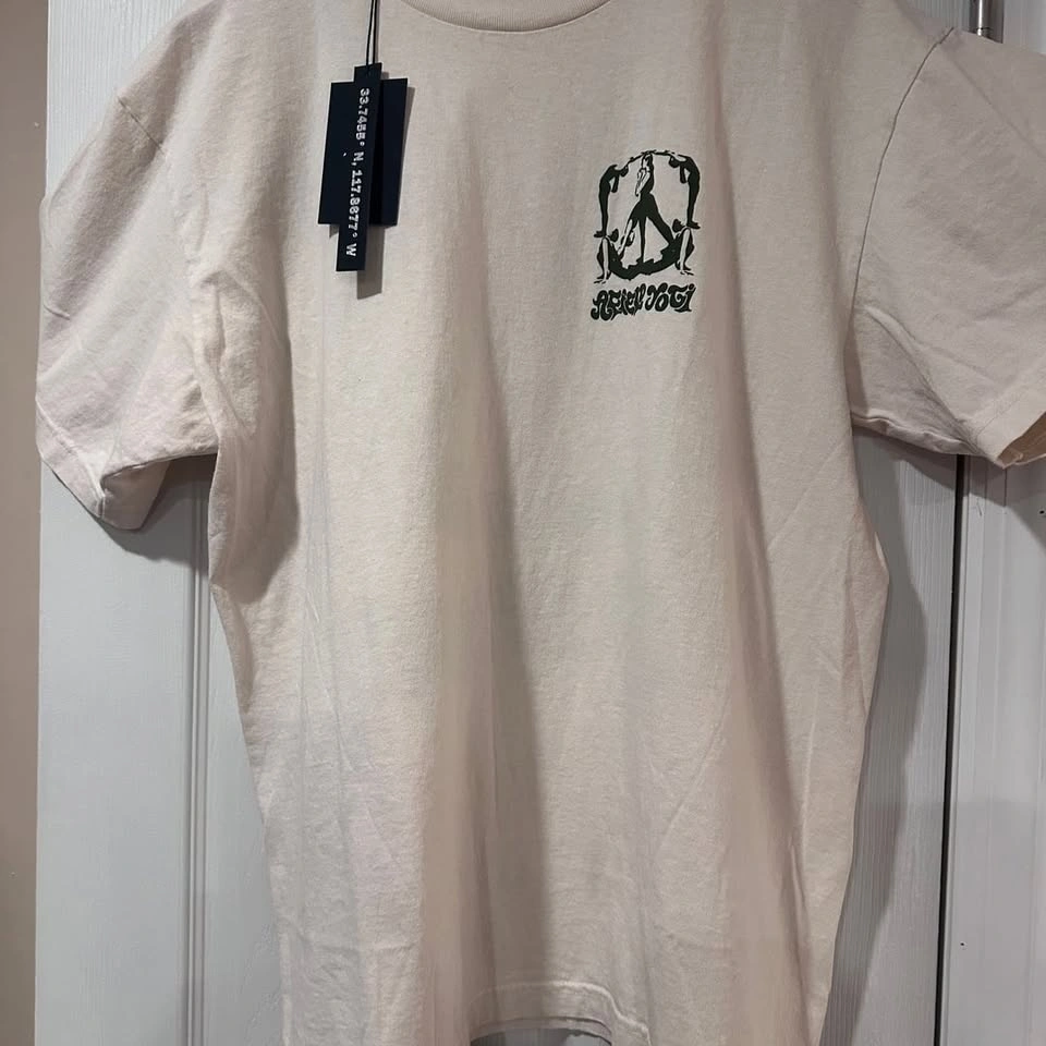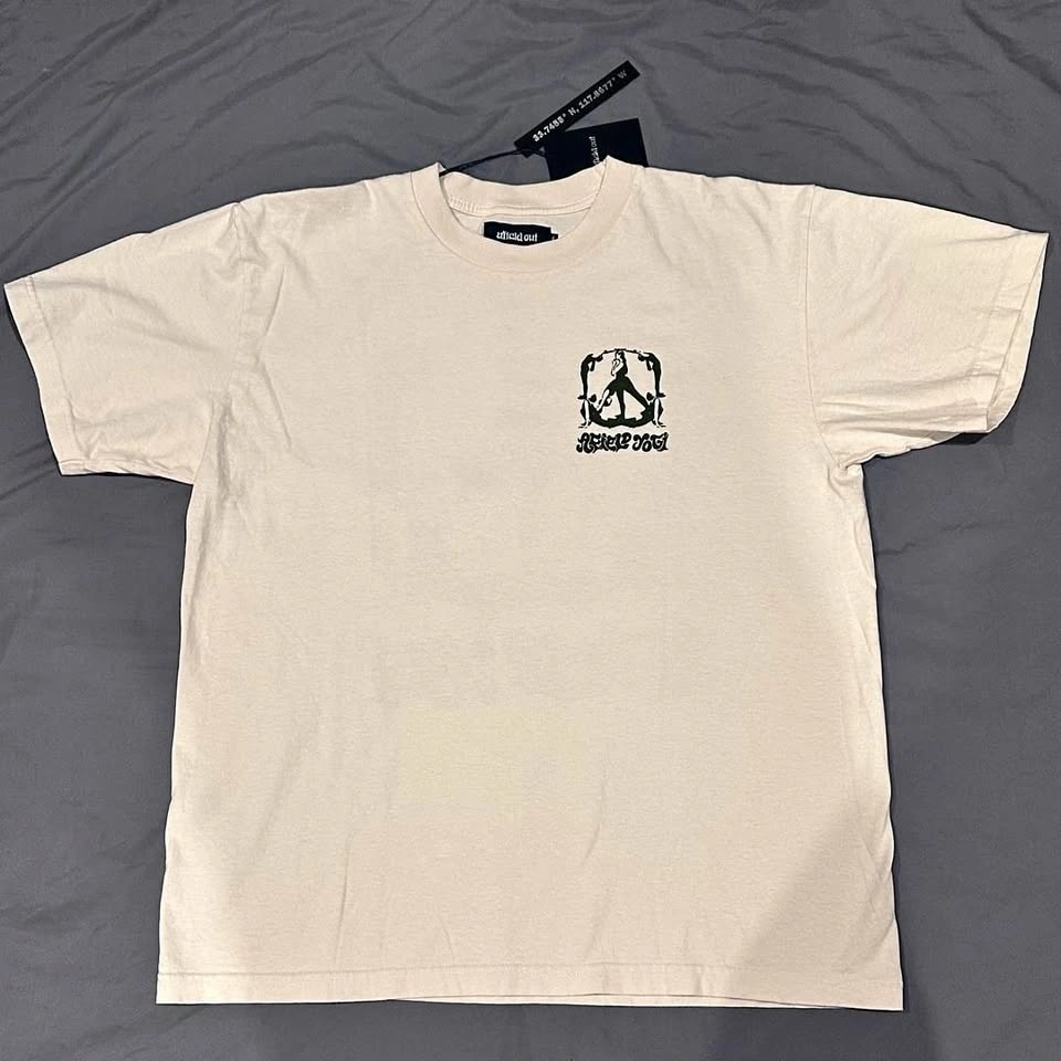 Afield Out Peace Graphic T-Shirt in a cream/off-white colorway. This relaxed-fit tee features a high-quality graphic on both the front chest and a large corresponding print on the back highlighting the brand's unique outdoor-inspired aesthetic. Made from soft, durable cotton, it is perfect for casual streetwear or outdoor adventures. Brand new with tags. Measurements: Body Length 27.7 in, Body Width 23.3 in. No flaws or wear.