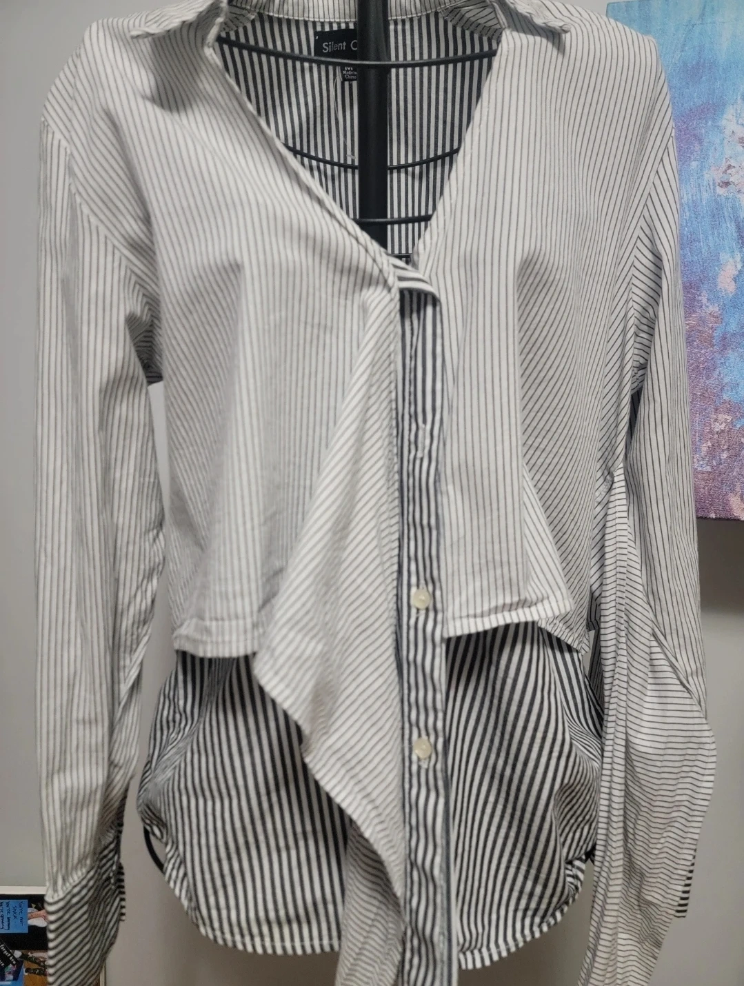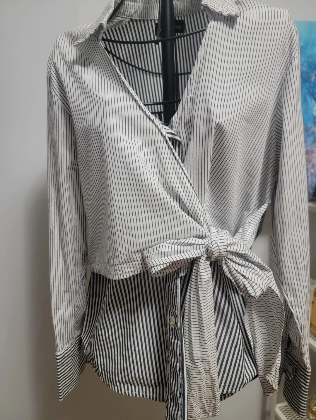 Here's a Silent C. striped wrap blouse in size small! It features a stylish wrap design with a tie at the waist and a black and white striped pattern. Great for adding a unique touch to your wardrobe!