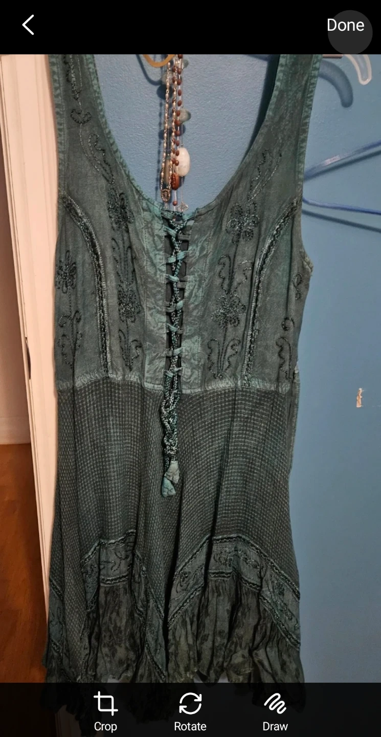 Here's a lovely green sleeveless dress with intricate embroidery! The dress features a unique lace-up detail at the top and a textured pattern on the skirt. It's in great condition and ready for a new wardrobe
