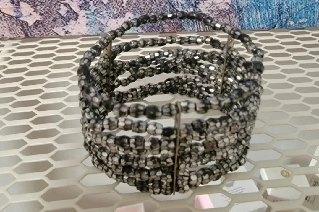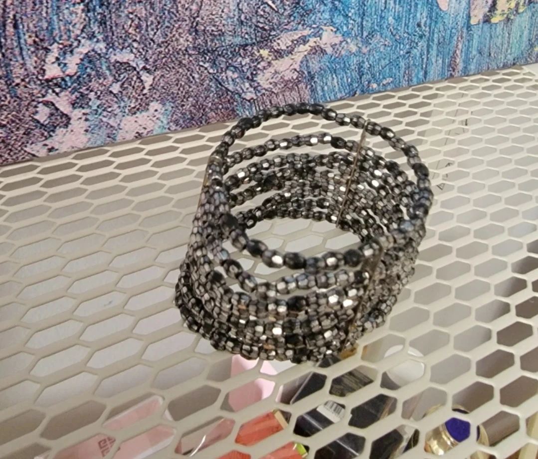 This is a beaded bracelet with a multi-strand design. It features a mix of black and silver-toned beads, creating a stylish and eye-catching accessory