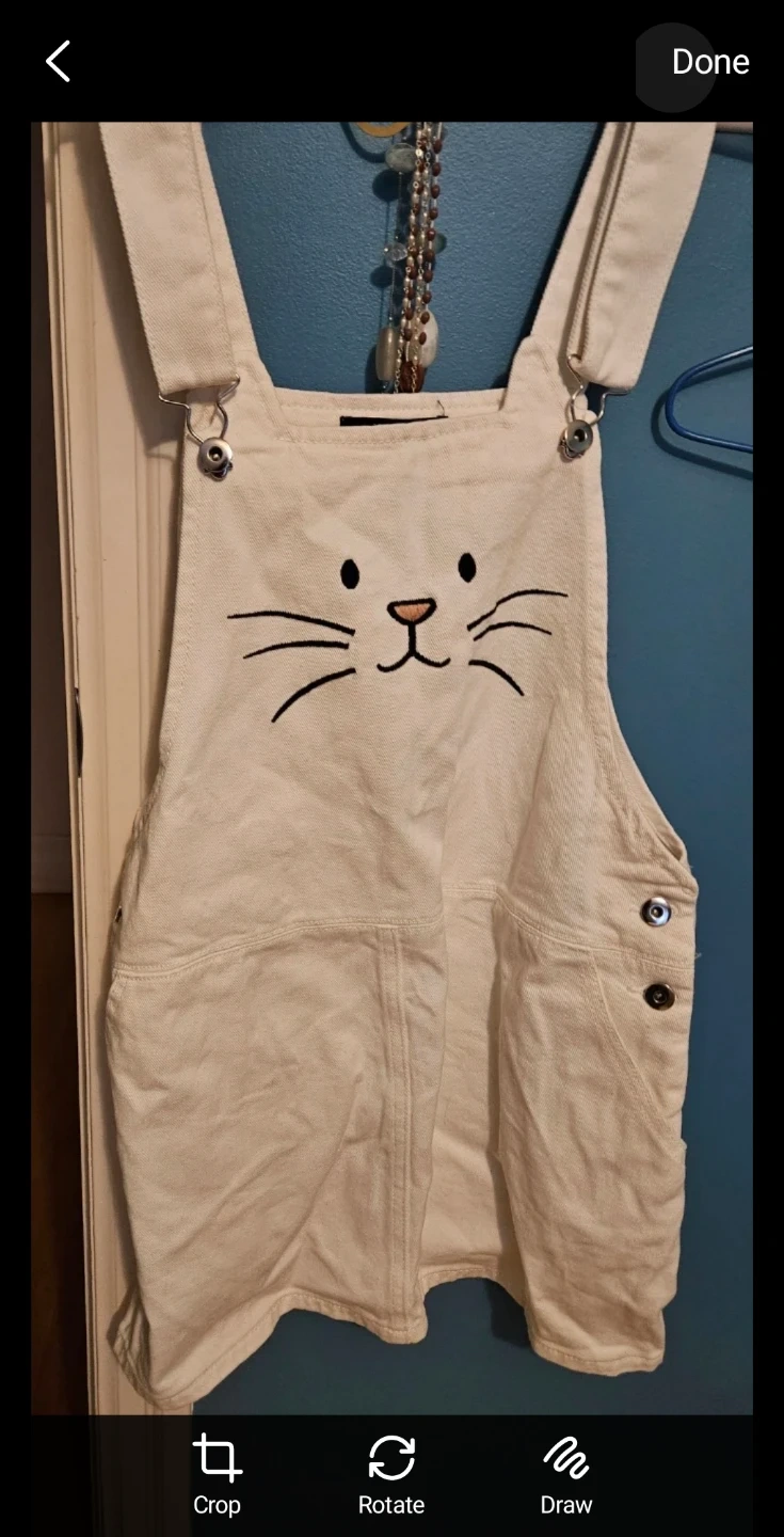 Cute white overalls with a cat face design on the front! Perfect for a casual and fun look. The material is a soft, white colour denim.