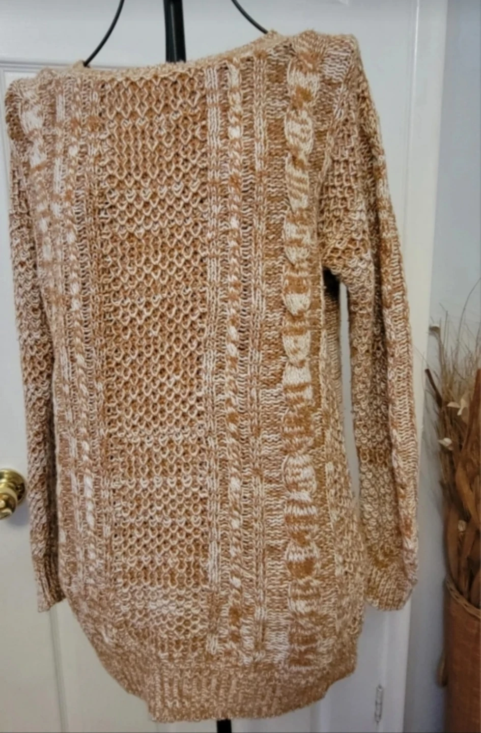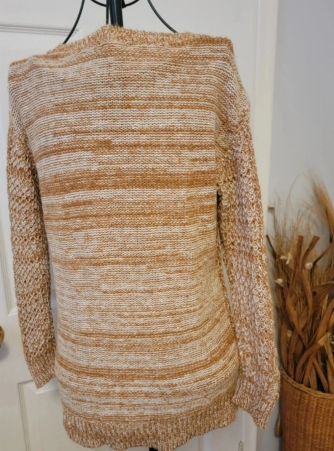 Selling a tan and white knit sweater. It's in great condition and ready for a new owner! It's a cozy and stylish piece perfect for layering or wearing on its own. The knit texture adds a unique touch to any outfit