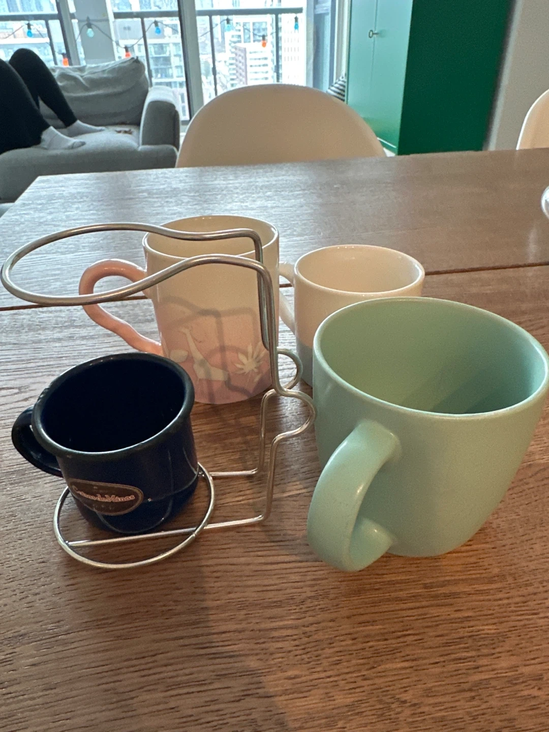 Giving away four mugs in various colours, including a light pink, white, mint green, and dark blue. They come with a convenient metal rack for easy storage and display. Perfect for adding a touch of variety to your morning coffee or tea!