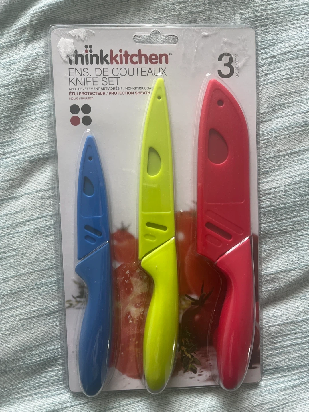Selling a brand new Thinkkitchen knife set! This set includes three knives with non-stick coating and protective sheaths. The knives are in blue, green, and red, and come in the original packaging.