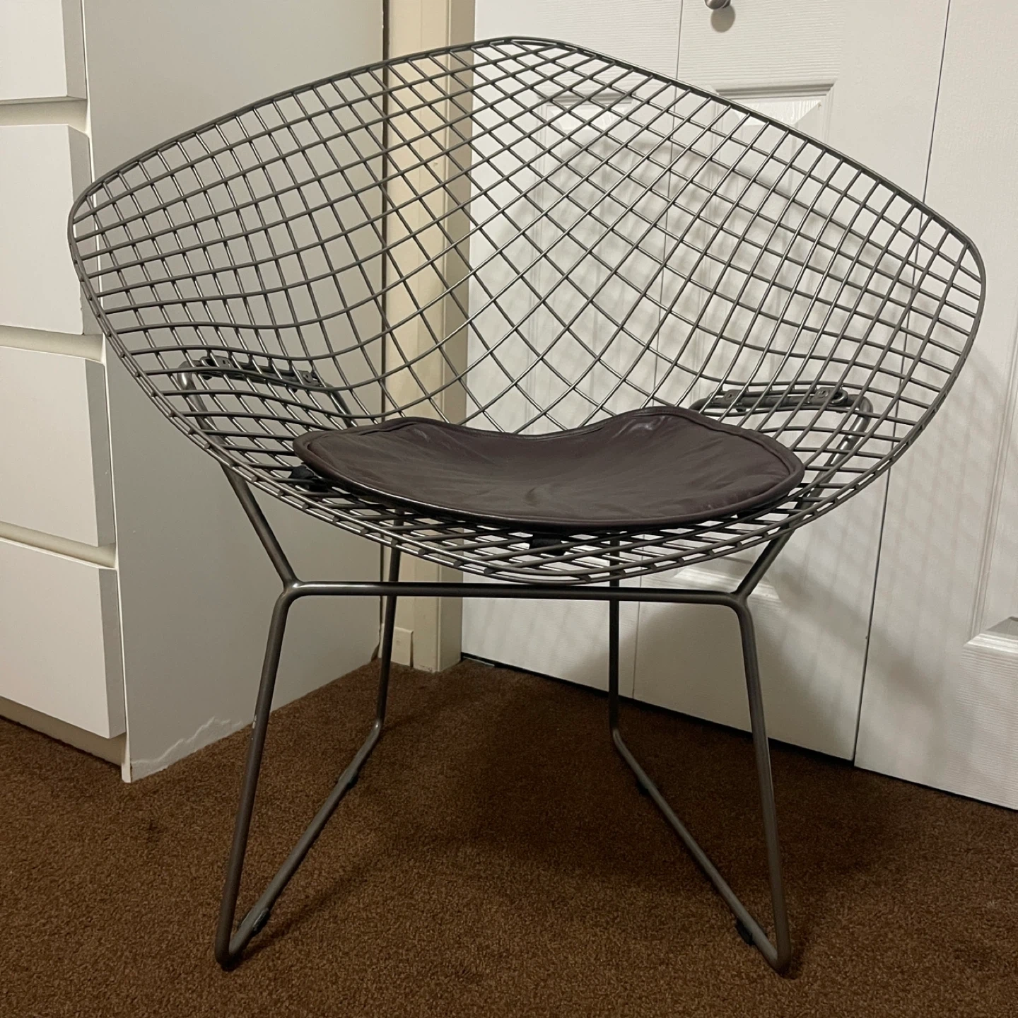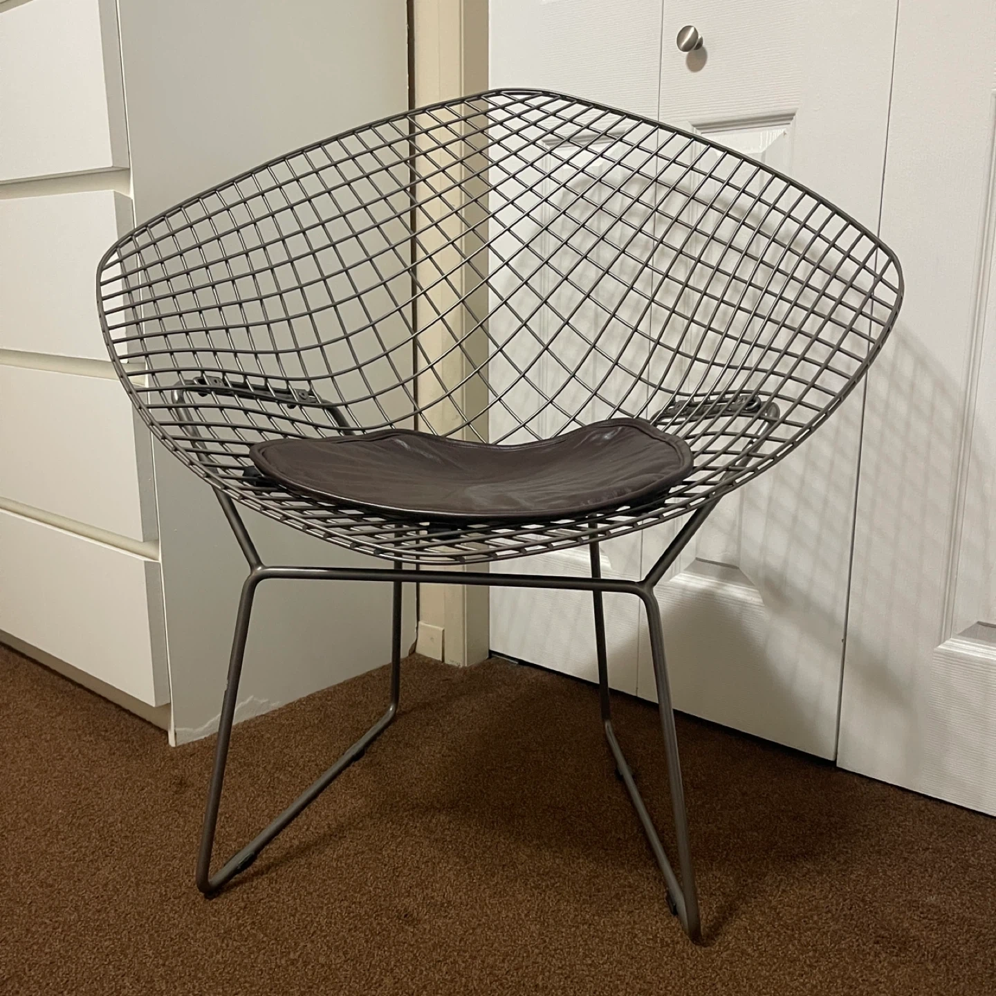 Own a Mid-Century Modern icon. This Bertoia-style Diamond Chair replica features a sleek, industrial chrome-finished wire frame and a comfortable faux-leather seat pad. Its sculptural silhouette adds a sophisticated, airy feel to any contemporary living space or office.