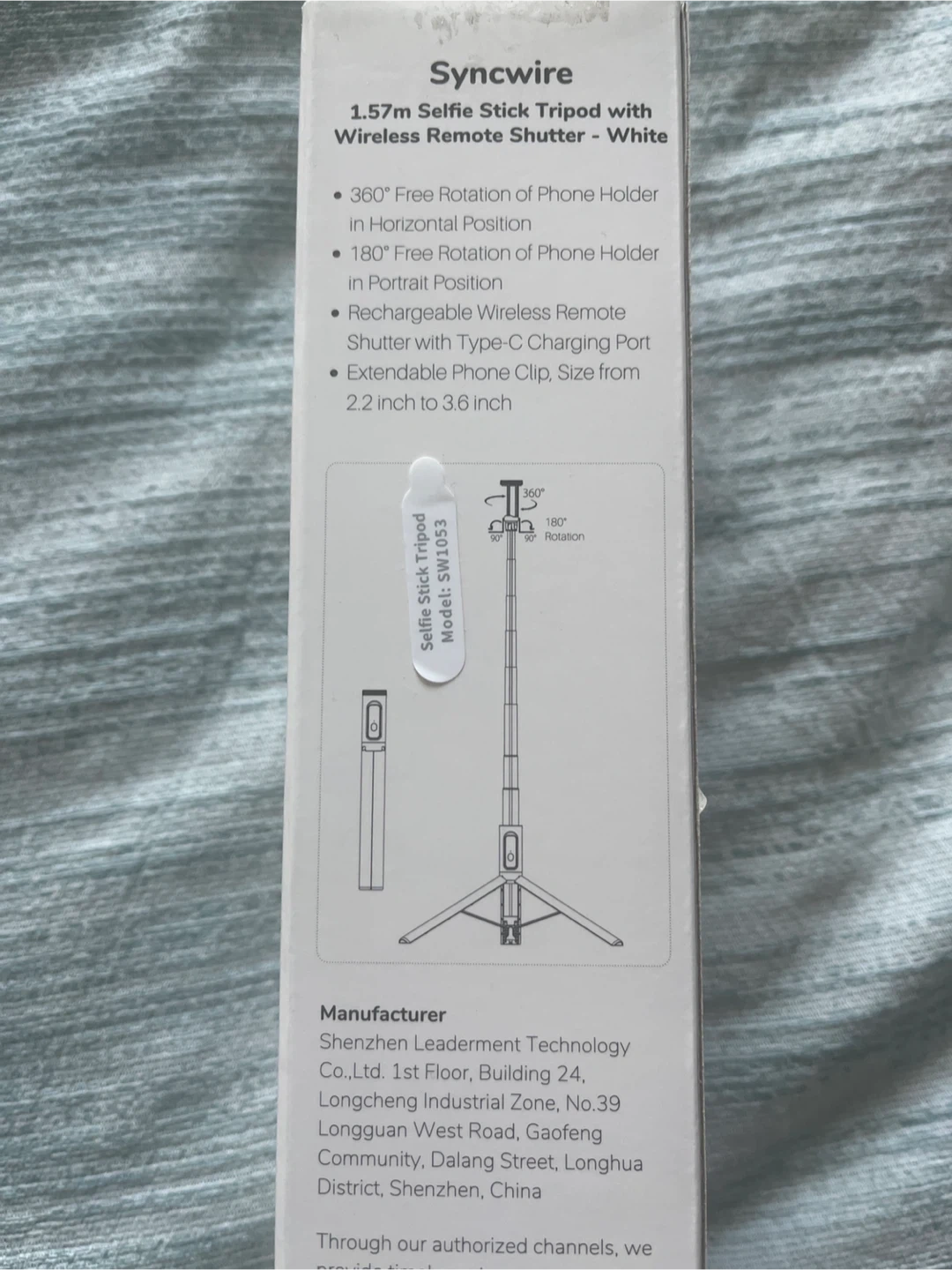 Selling a Syncwire 1.57m selfie stick tripod with a wireless remote shutter in white. It features 360° free rotation for horizontal phone holding and 180° free rotation for portrait positions. It also has a rechargeable wireless remote shutter with a Type-C charging port and an extendable phone clip that fits phones from 2.2 inches to 3.6 inches. Model: SW1053.