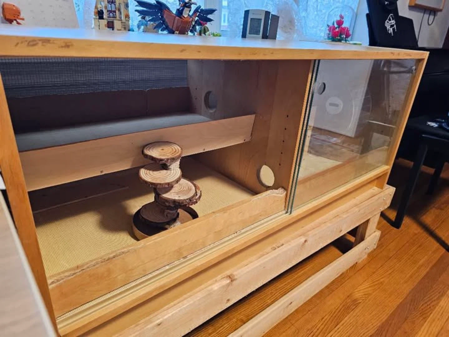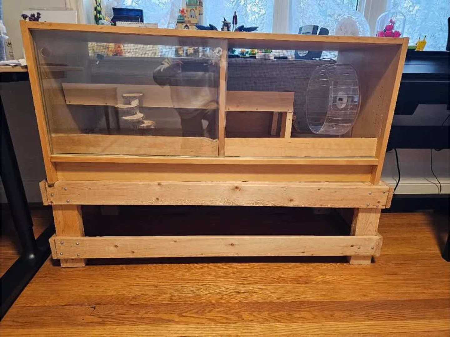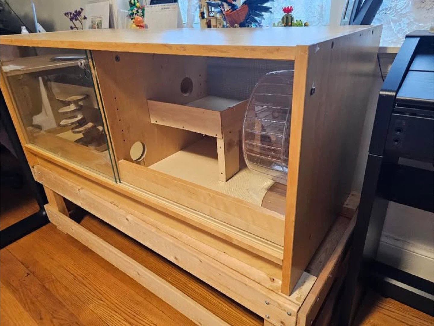 Homemade hamster cage made from a light-colored wooden bookshelf.