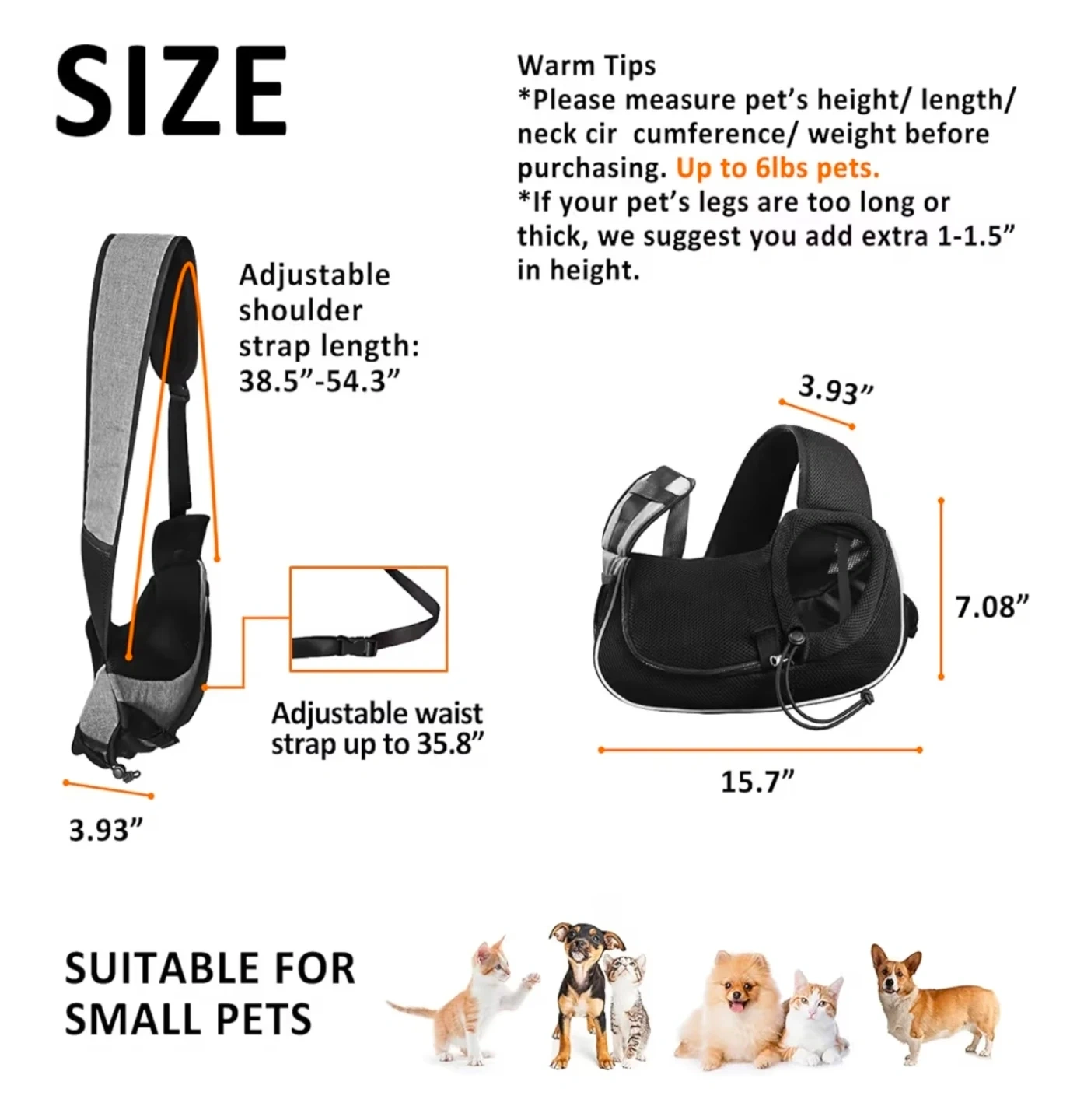 Keep your furry friend close with this comfy pet carrier sling! It's black and grey, perfect for small pets (puppies, cats). The sling has an adjustable shoulder strap (38.5"-54.3") and waist strap (up to 35.8"). It also features handy pockets for toys, treats, your phone, and even garbage bags! Barely used, in perfect condition.