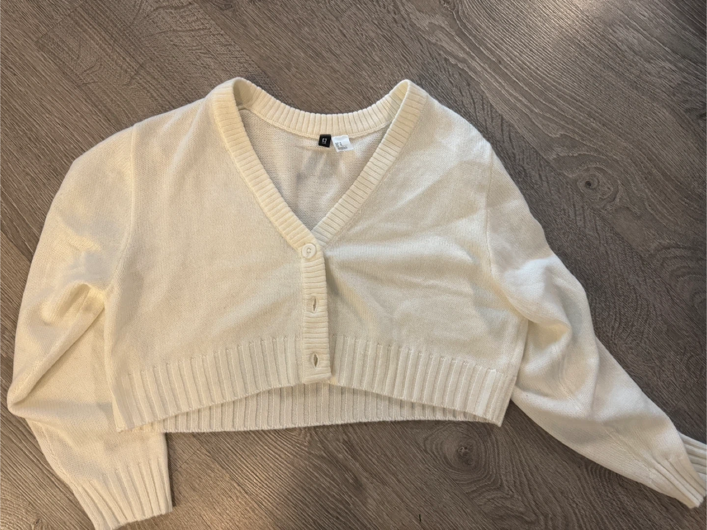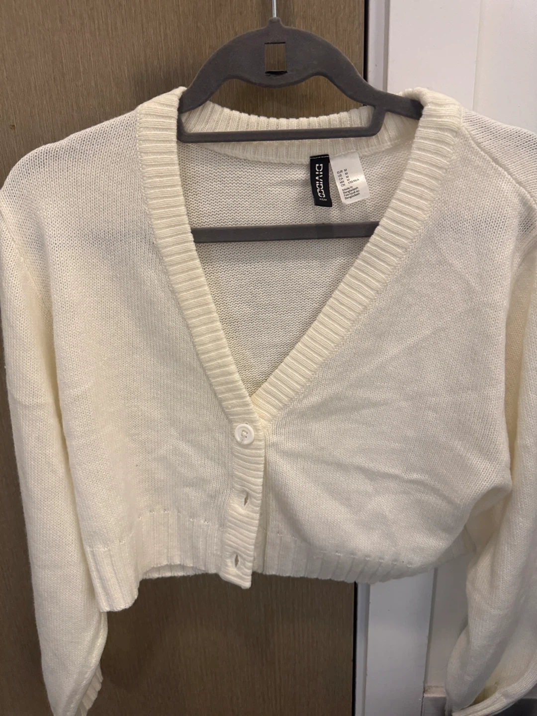 Selling a cute cream-coloured cropped cardigan from H&M. It's in great condition and perfect for layering or wearing on its own. A stylish and versatile piece to add to your wardrobe!