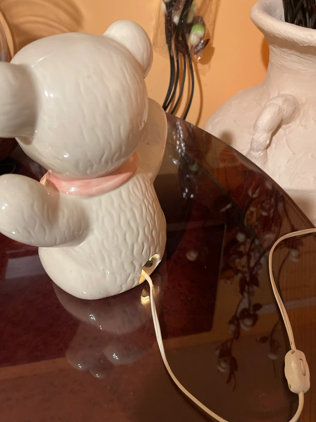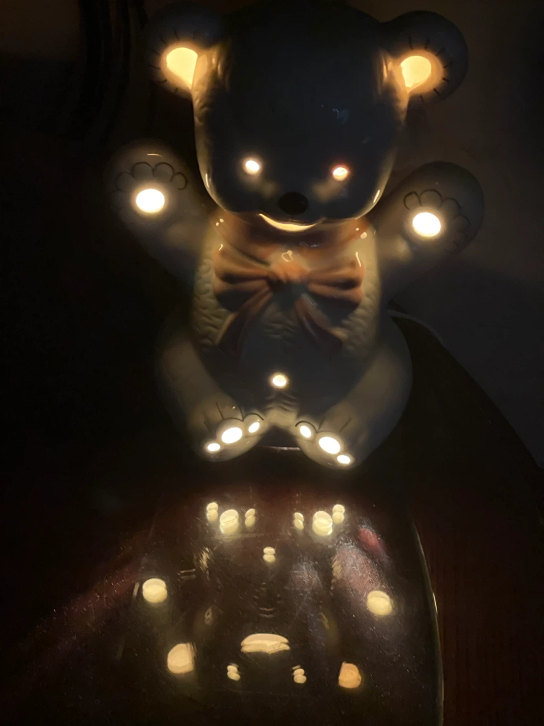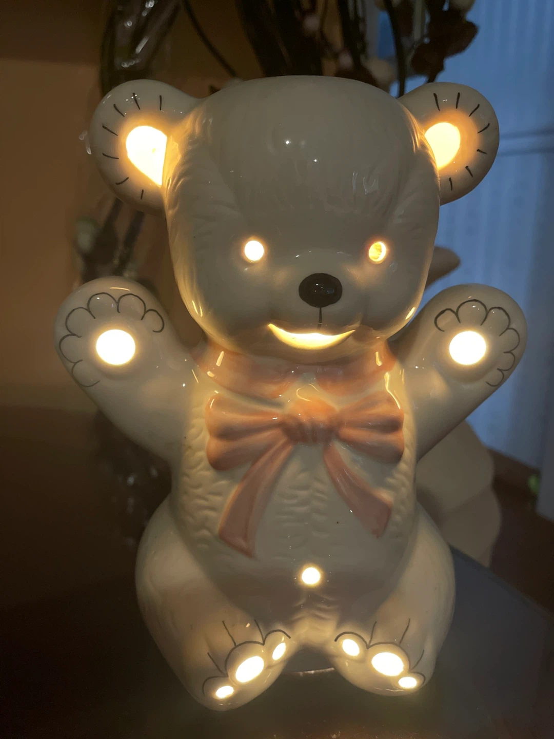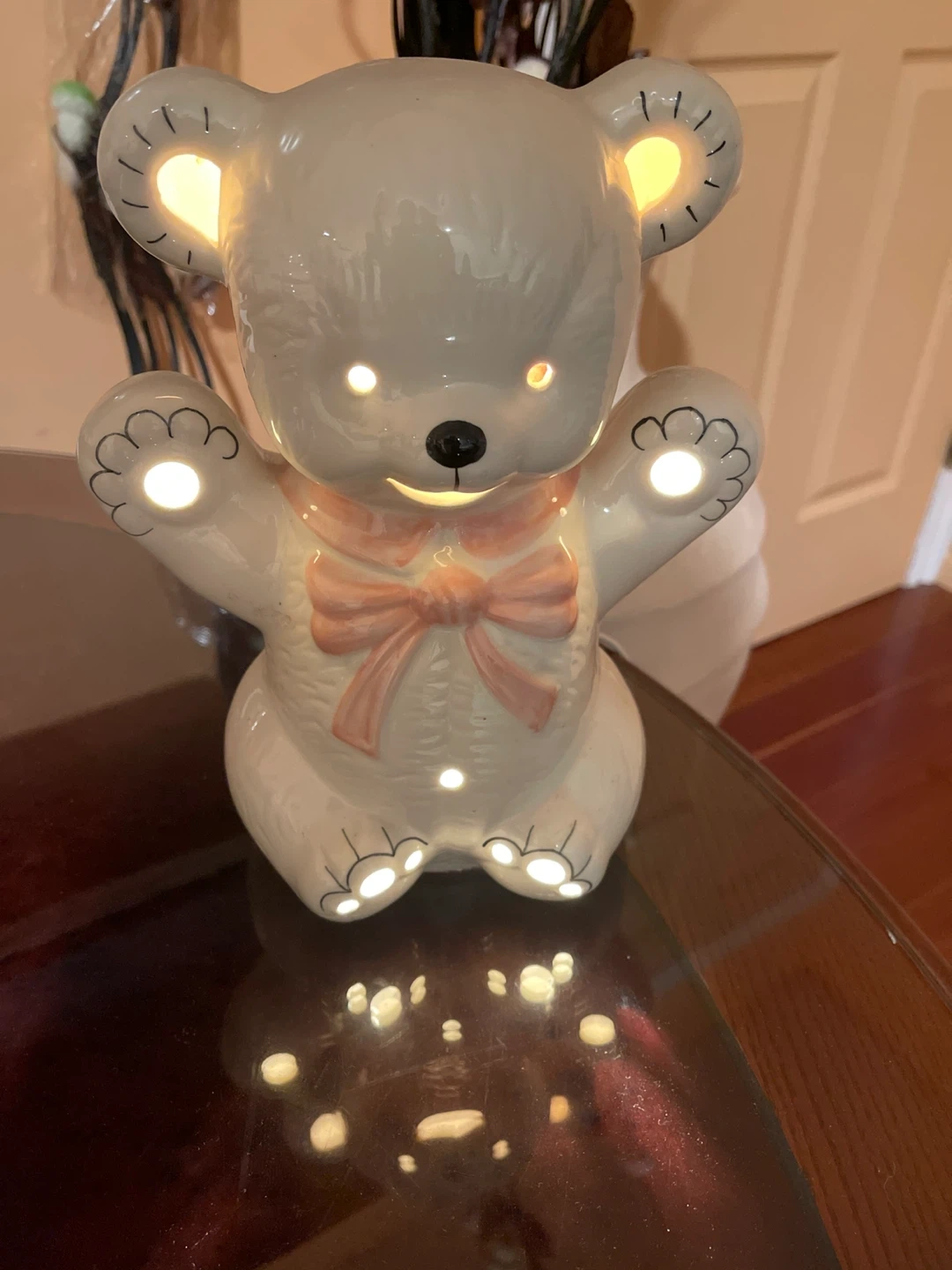 Here's a cute teddy bear night light! It's in great shape and gives off a warm, comforting glow. Perfect for a kid's room or anyone who loves a bit of whimsy