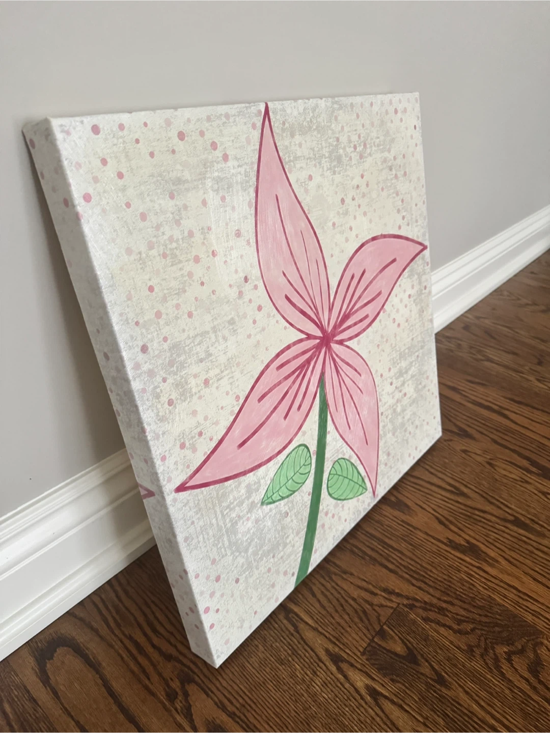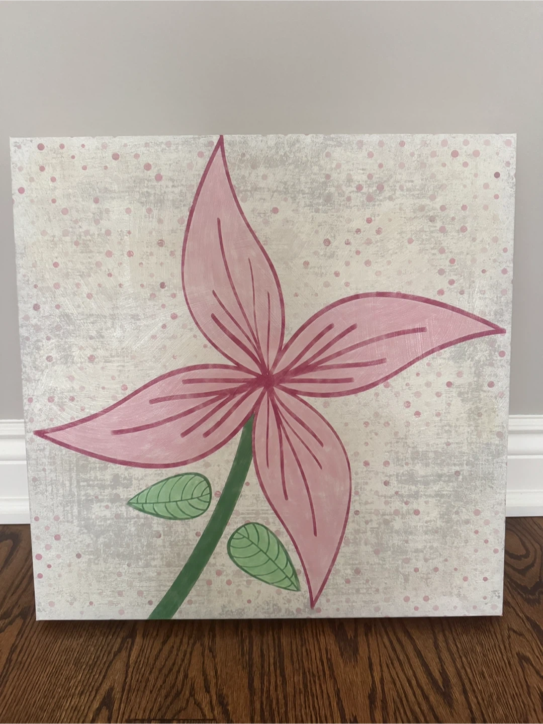 A cute flower painting on canvas, perfect for adding a touch of whimsy to any room! The artwork features a pink flower with green leaves on a lightly textured background. It's in great condition and ready to brighten up your space