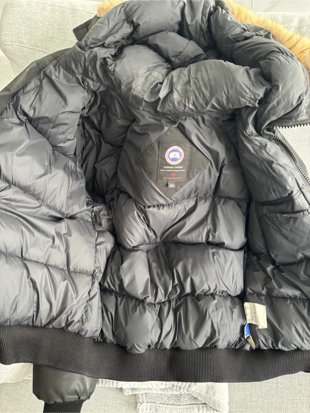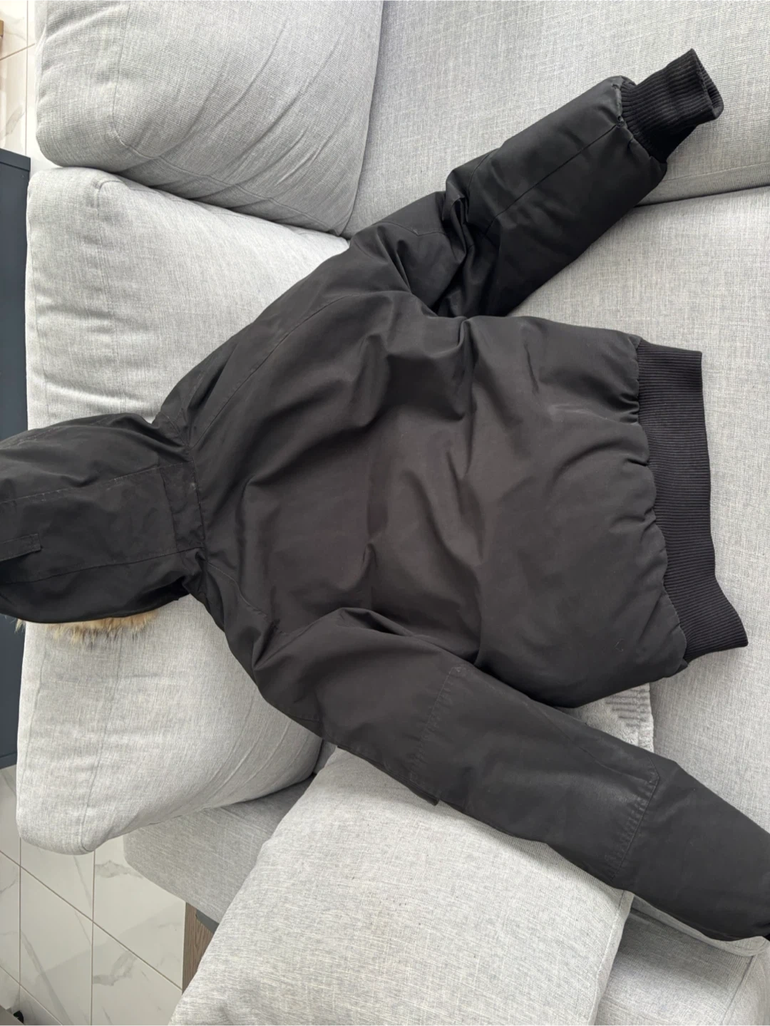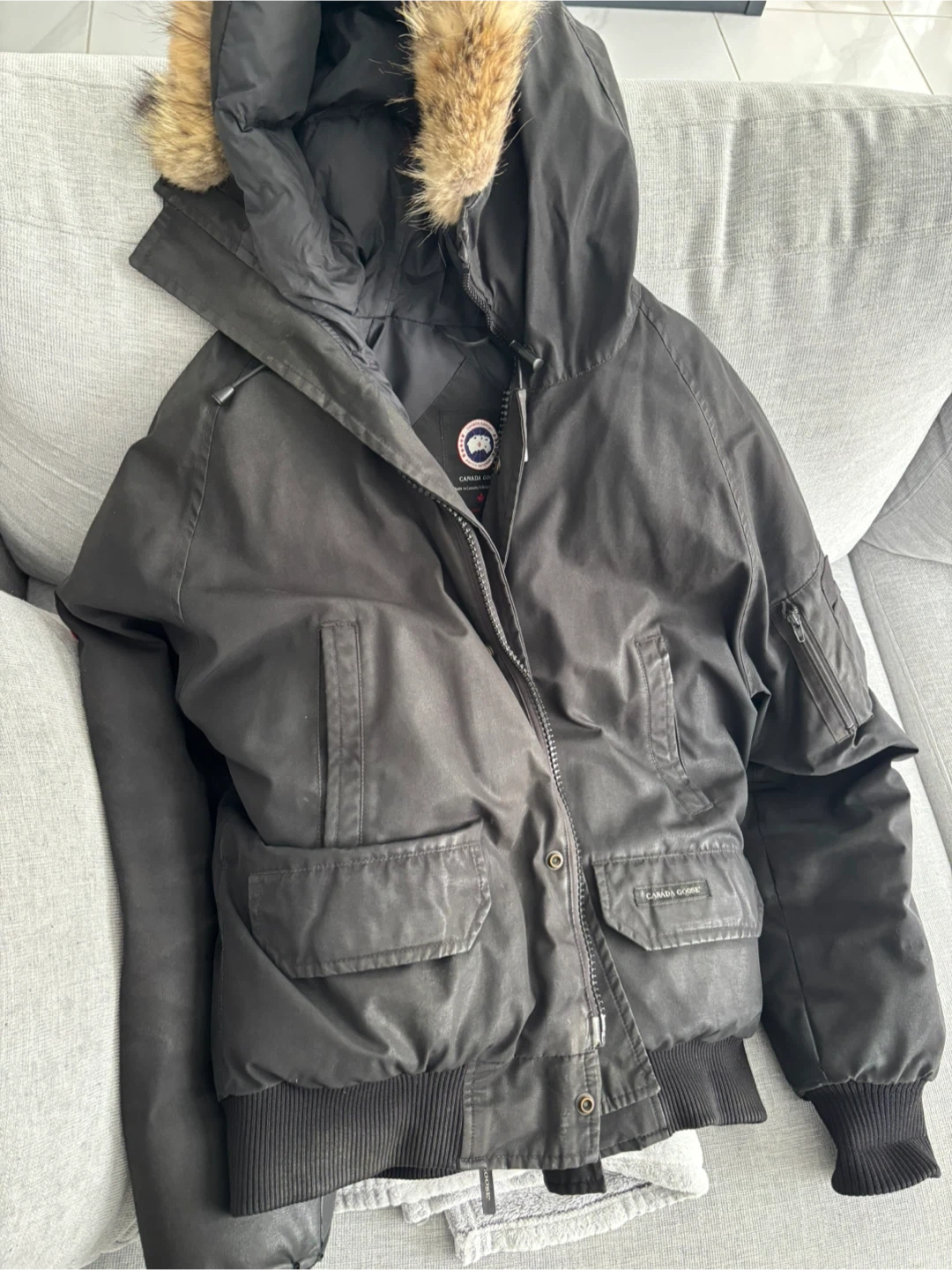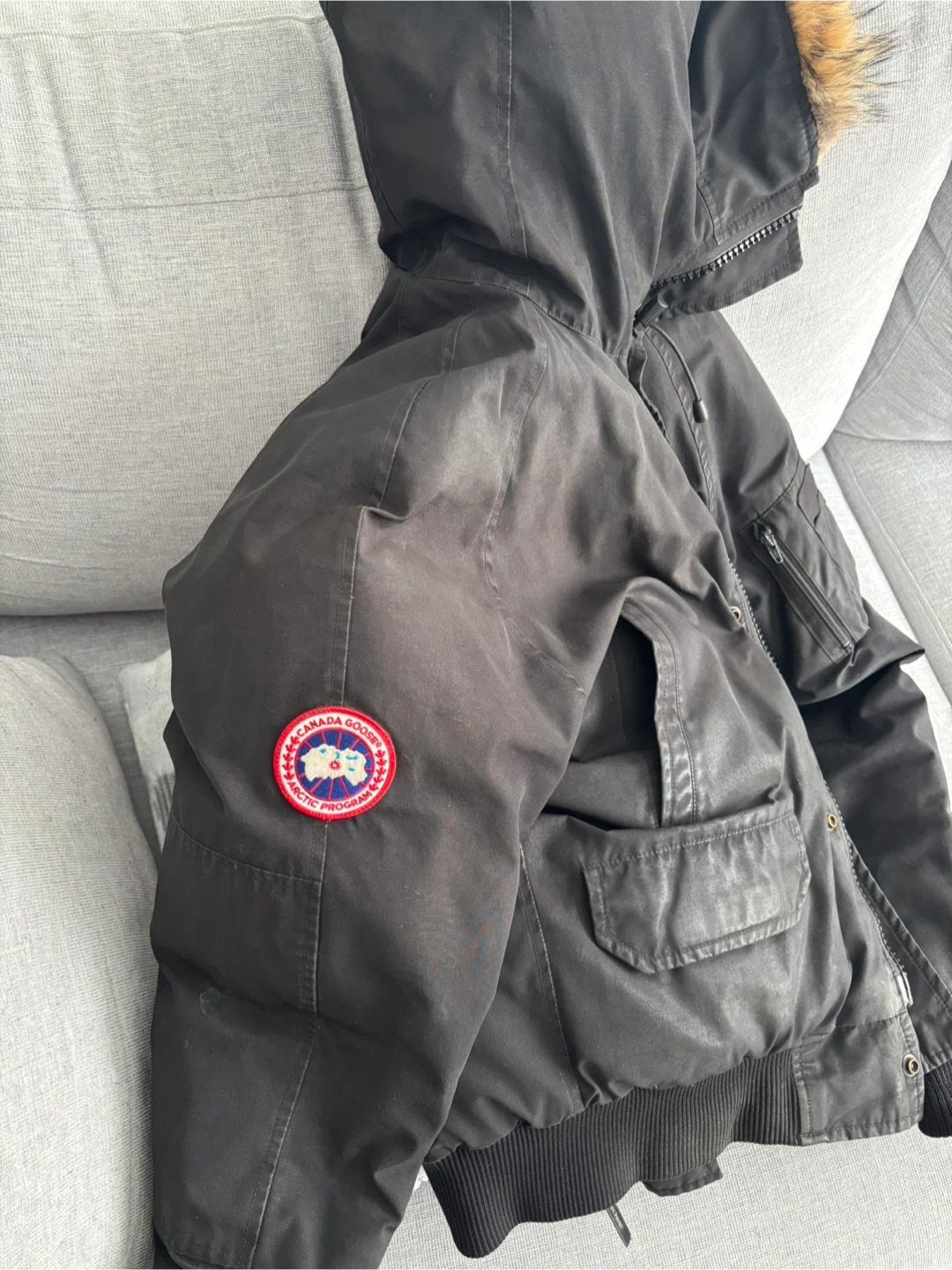 Selling a Canada Goose bomber jacket in black. There are some signs of wear on the sleeve, as shown in the pictures. It's still a great jacket for keeping warm during the colder months!