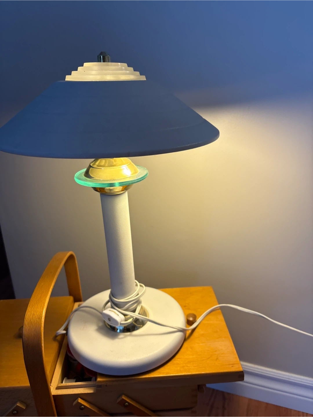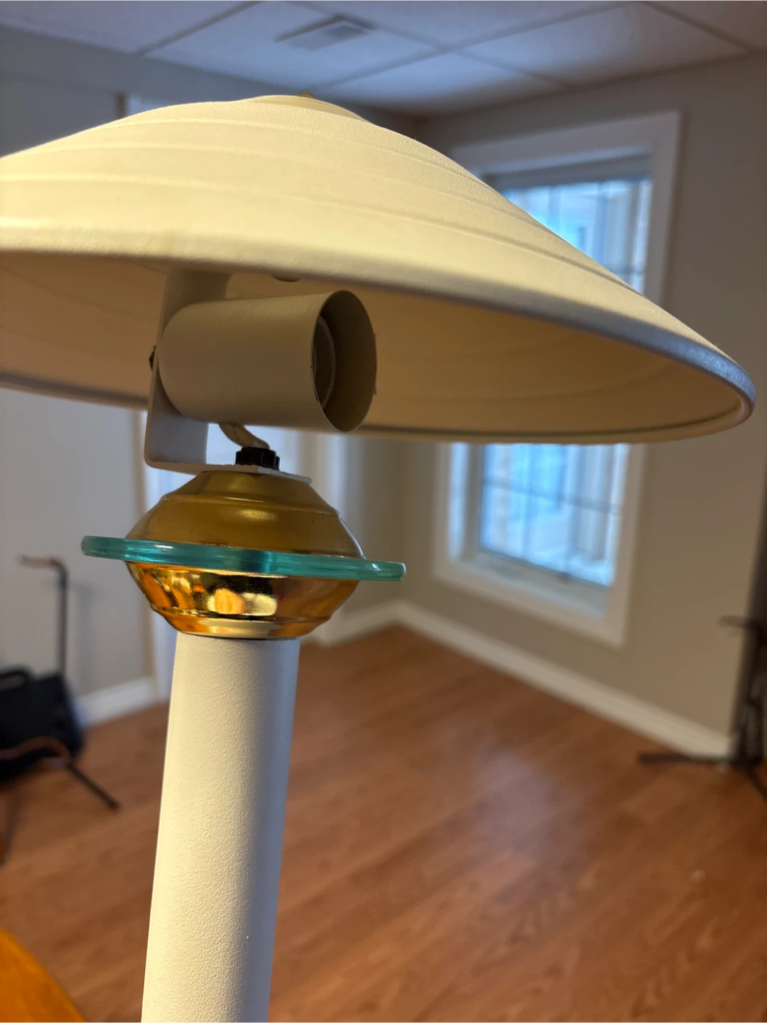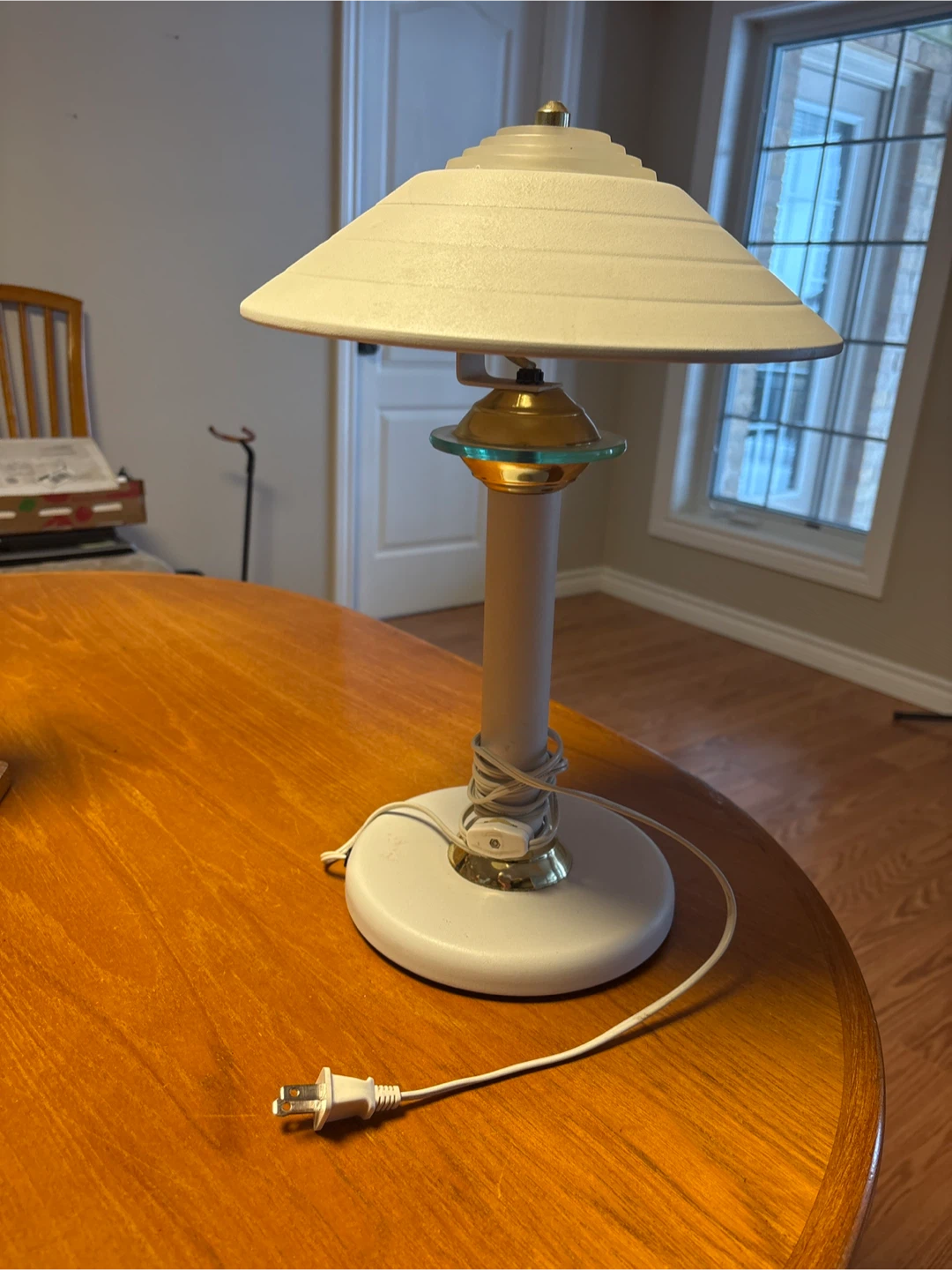 White table lamp with a mushroom-style shade in great condition The lamp has a unique design with a gold-coloured accent and a circular base. It's perfect for adding light to your space or for reading/study purposes…**pick up on Chandos Drive in Chicopee area of South Kitchener N2A4H8