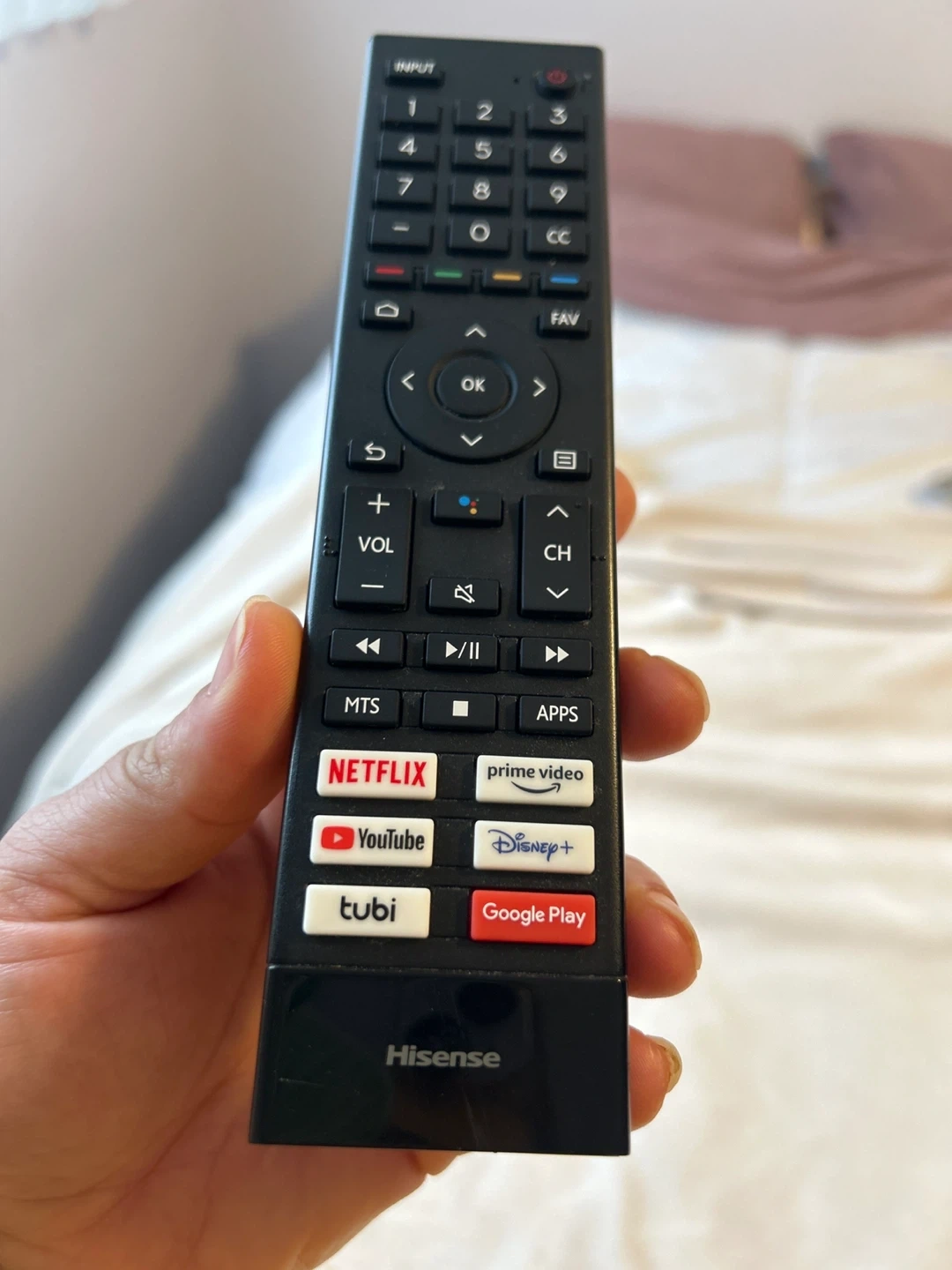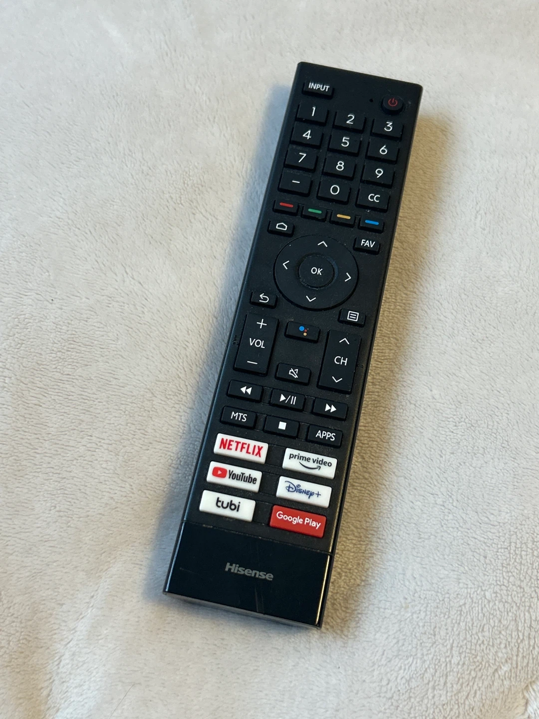 Selling a Hisense TV remote in great condition! It has buttons for Netflix, YouTube, Disney+, Prime Video, Tubi, and Google Play