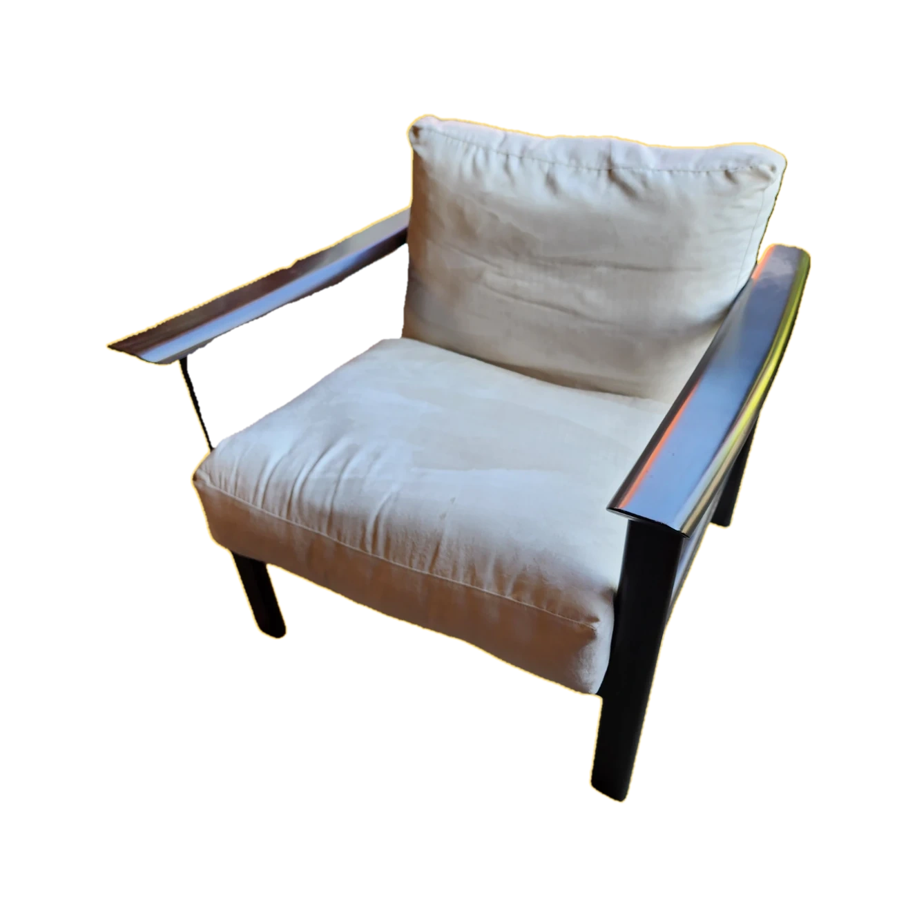 Selling a comfy armchair! It has a neutral beige colour with soft cushions. The frame appears to be dark wood with metallic armrests. It's in good condition and would look great in any living room or bedroom