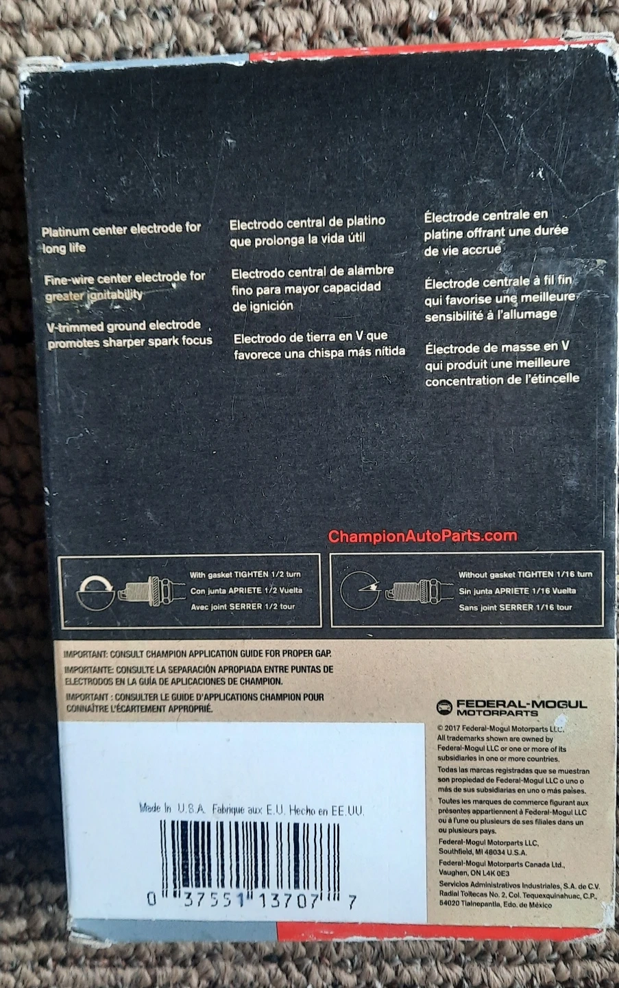 Set of Champion Platinum spark plugs. New. Platinum center electrode for long life and fine-wire center electrode for greater ignitability.