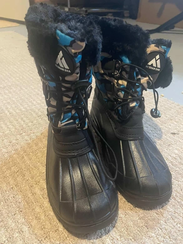 These MI SHAN SHA winter boots are perfect for keeping your feet warm and dry during the cold months! They feature a black rubber sole and a fun camo pattern on the upper part of the boot