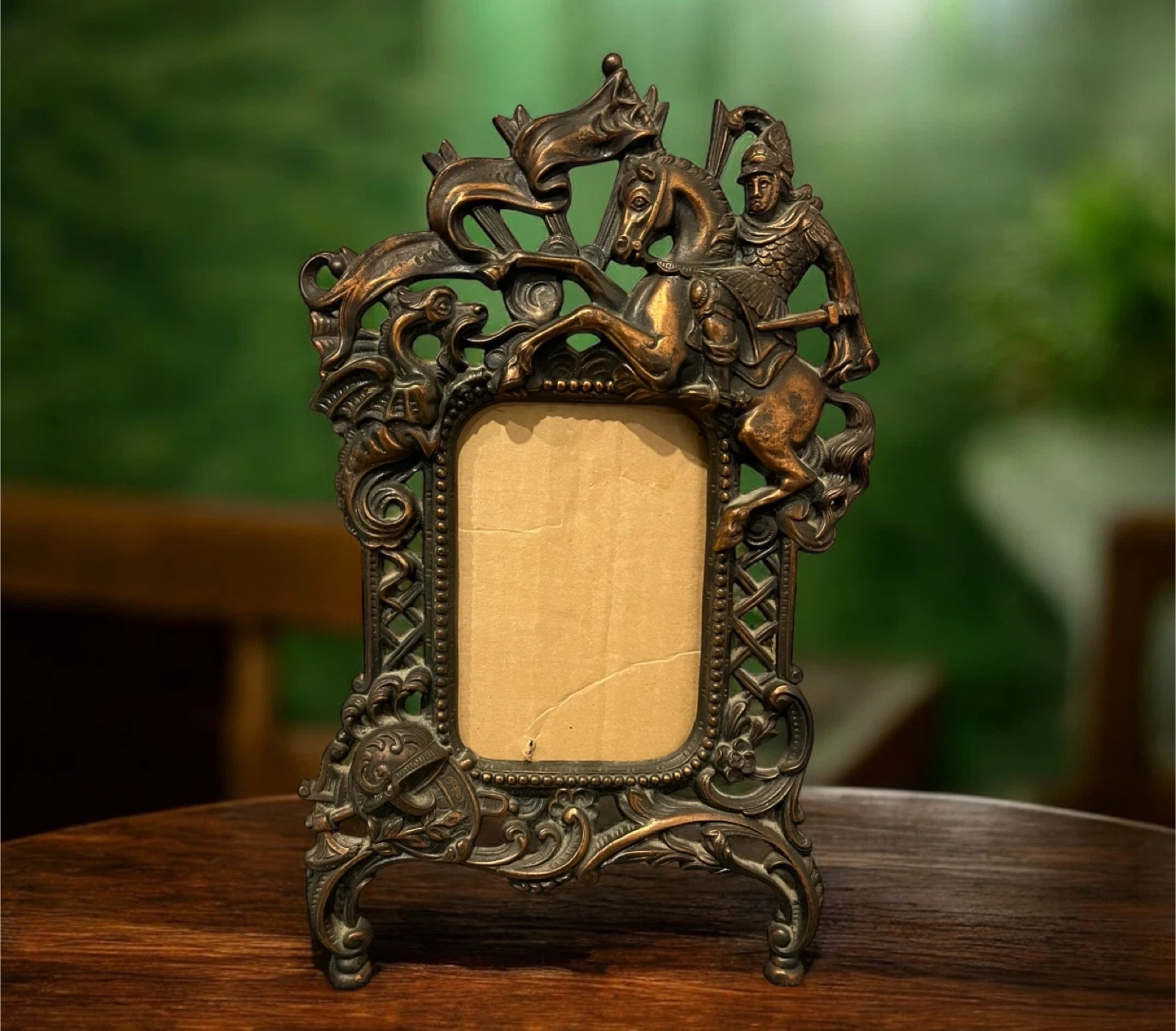 This is a vintage antique brass photo frame depicting Saint George slaying the dragon. It could use a clean up/shine, otherwise in great condition.