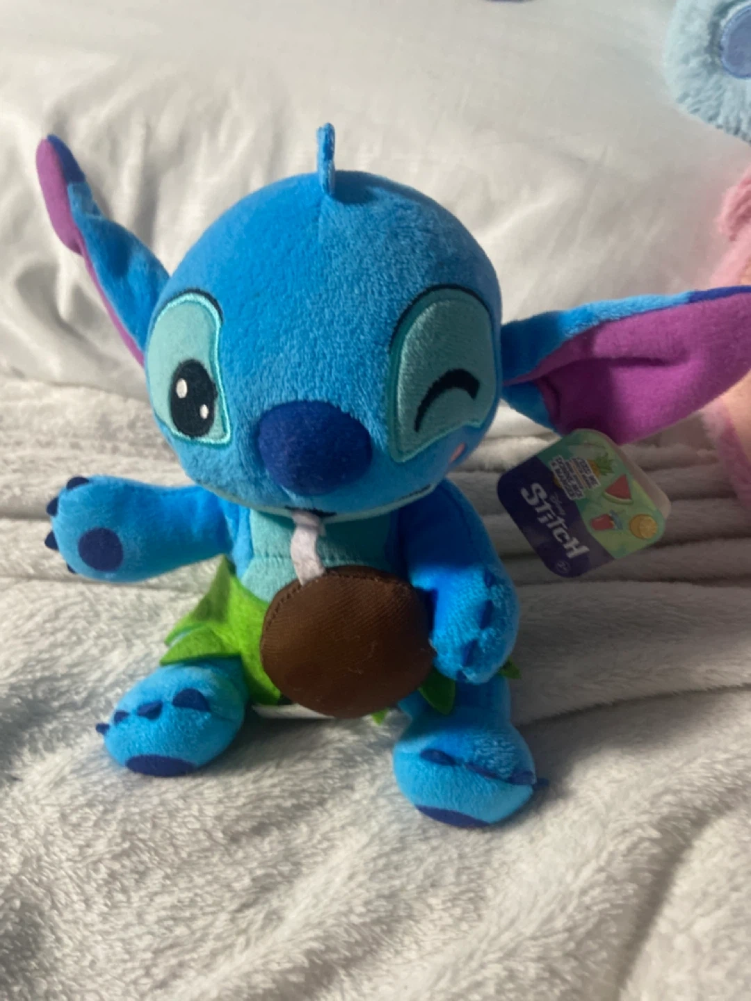 Selling a cute Stitch plush toy! It's in great condition and ready for a new home. This adorable plush features Stitch wearing a little green skirt and holding a coconut. Perfect for any Disney fan!