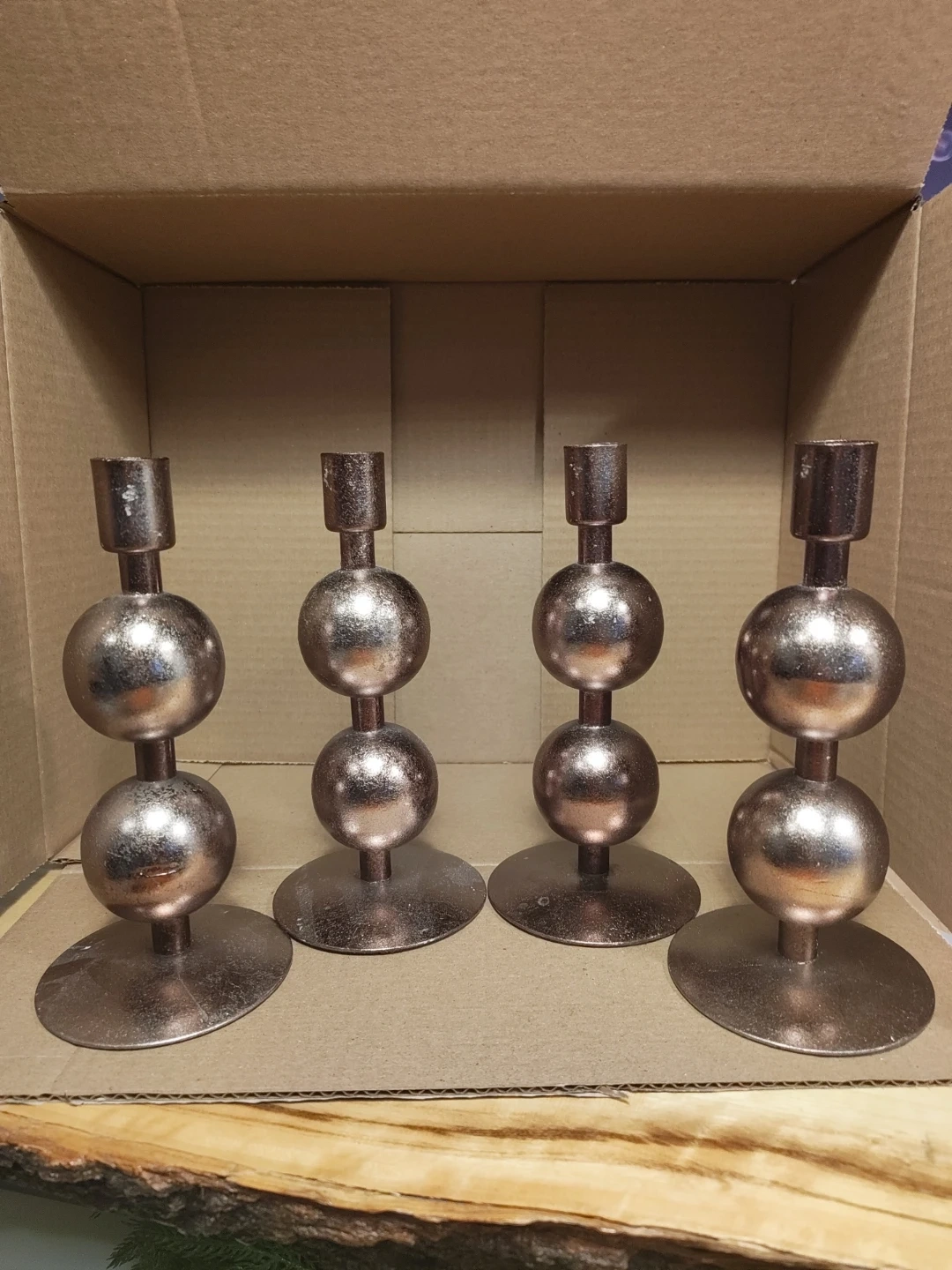 Selling a set of four metal candlestick holders. They have a unique spherical design and are in good condition. Perfect for adding a touch of modern elegance to your home decor! Normally $24.99 each selling set /4 for $20