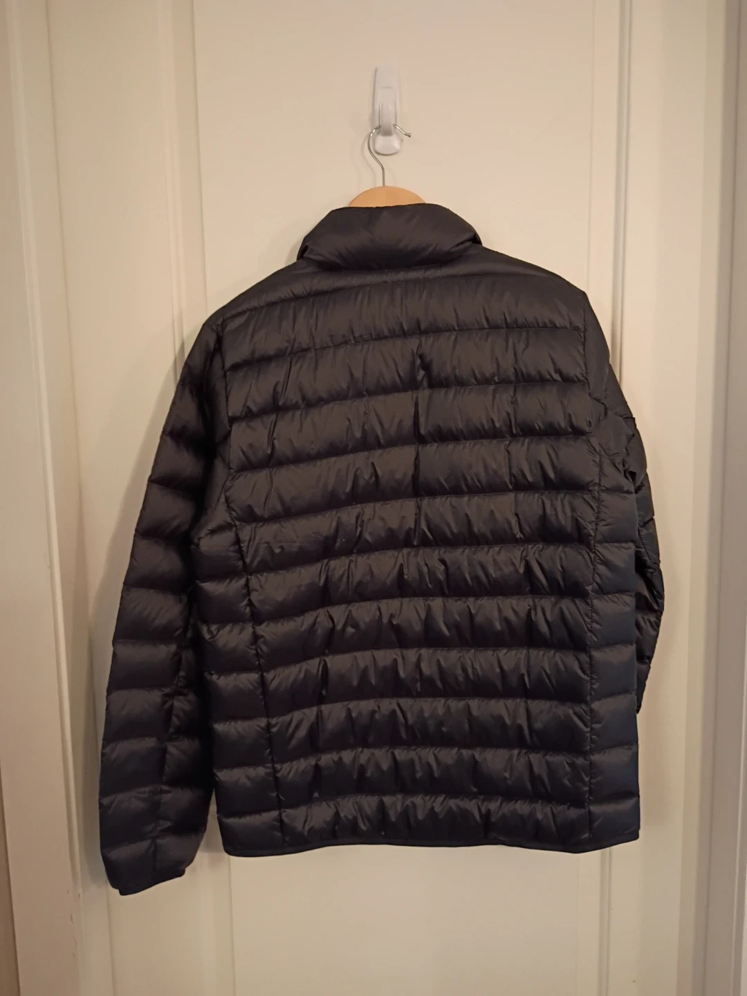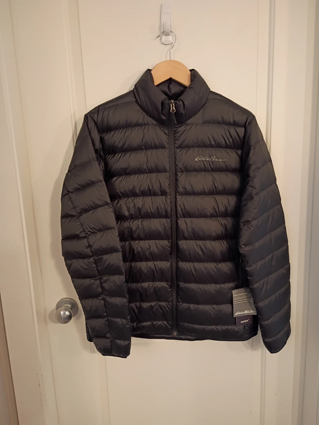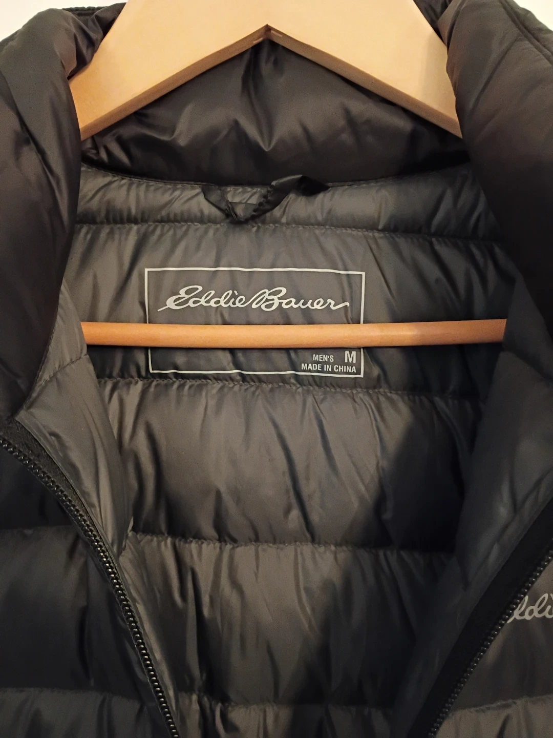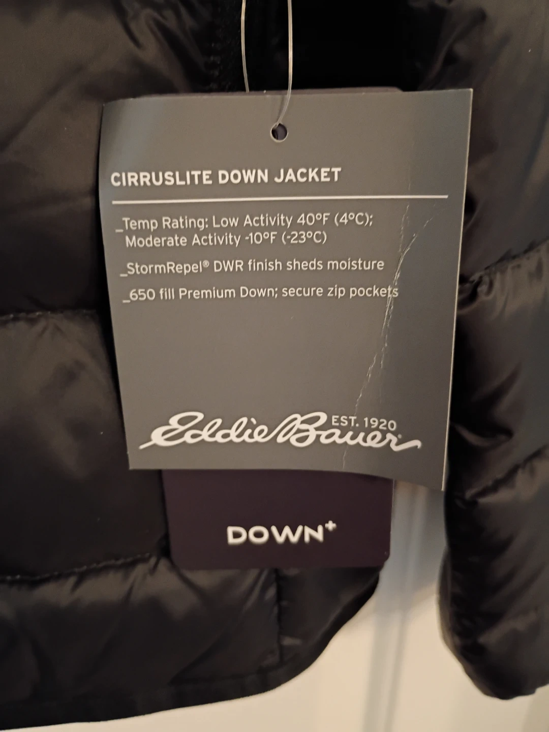 Selling an Eddie Bauer CirrusLite down jacket in men's size medium. It's a sleek black colour and features StormRepel DWR finish that sheds moisture. It's also got 650 fill premium down and secure zip pockets. Great for low activity in cold weather.