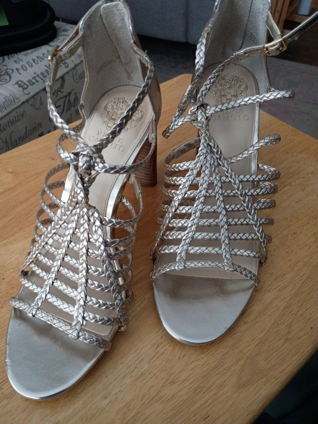 9.5 and feature a strappy, braided design. They're in great condition and would be perfect for a night out or a special occasion!