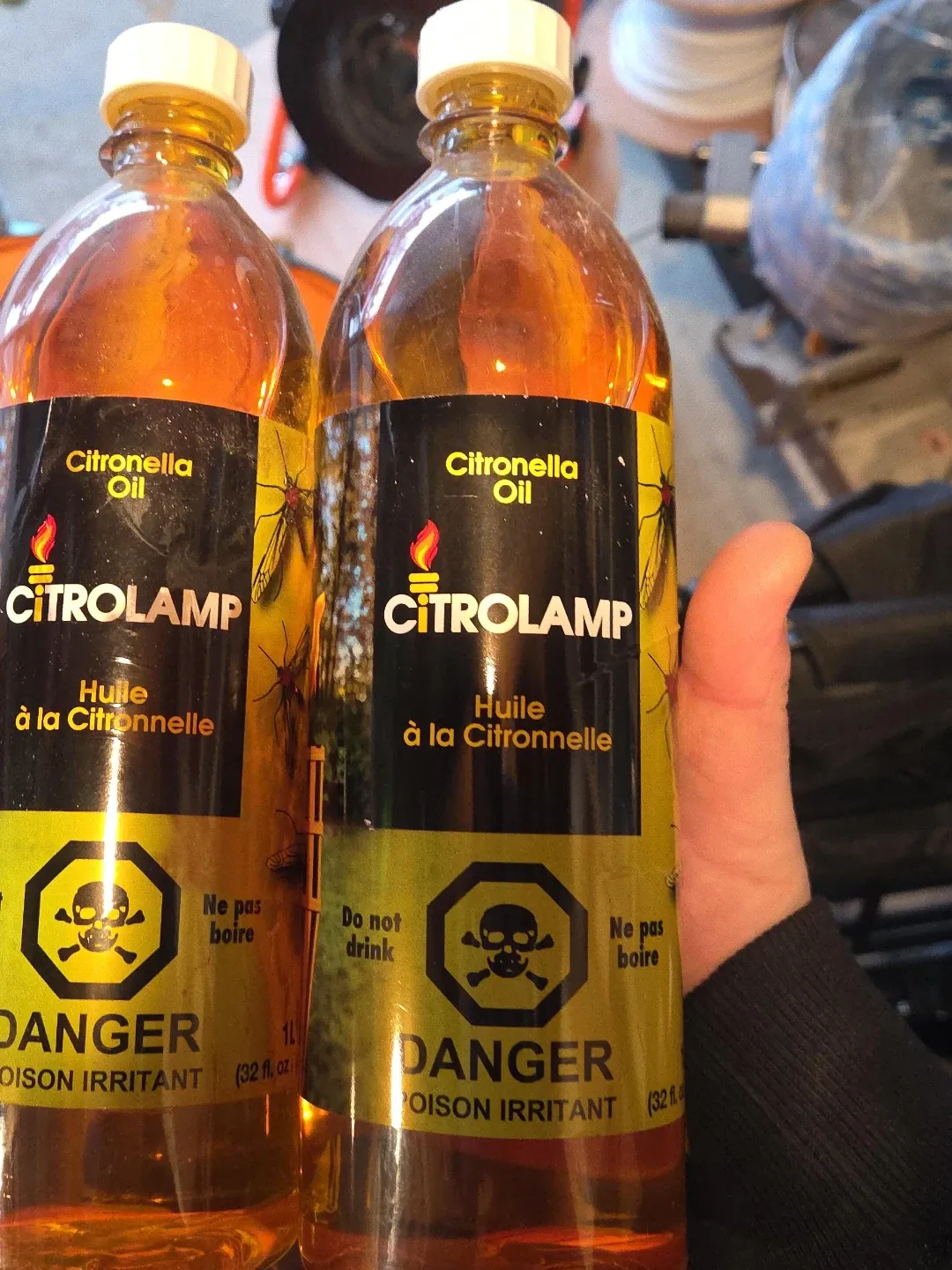 I have two bottles of Citrolamp Citronella Oil for sale. Each bottle contains 1 litre (32 fl. oz) of citronella oil. Please note the danger and caution labels, and remember: Do not drink!