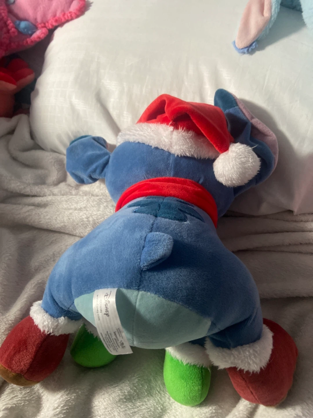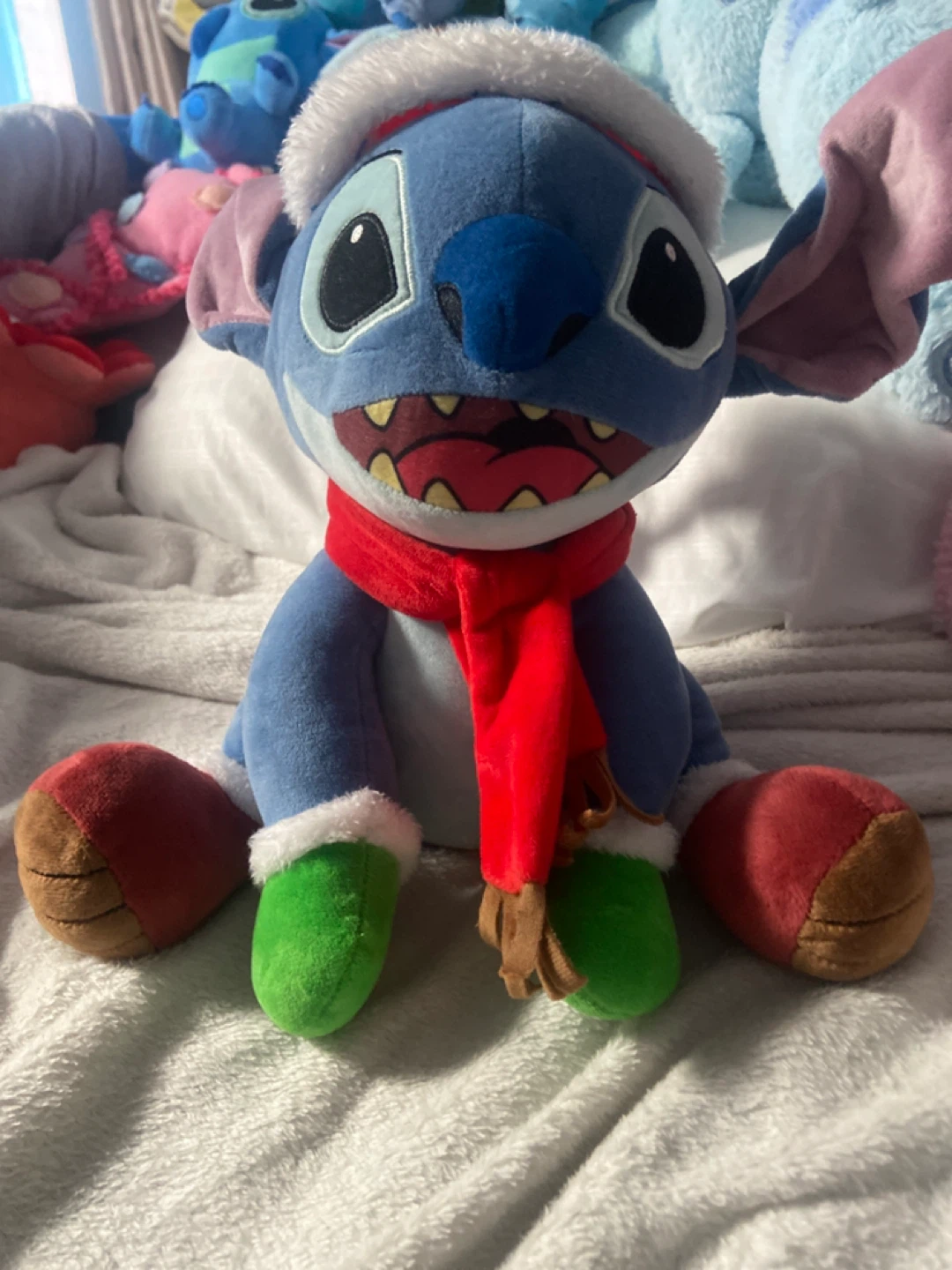 Selling a cute Stitch plush toy dressed up for Christmas! It features Stitch in a Santa hat and scarf. Perfect for any Disney fan or as a festive decoration!
