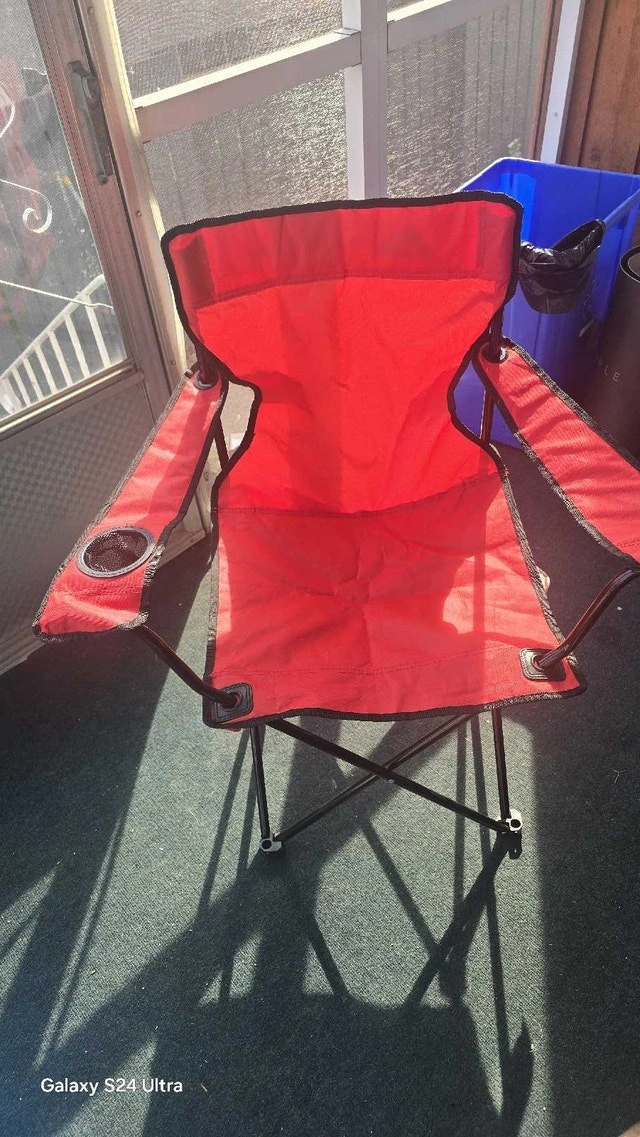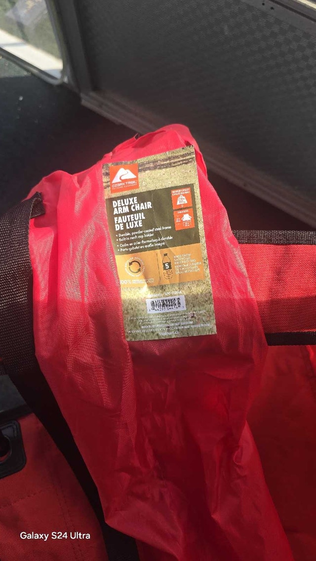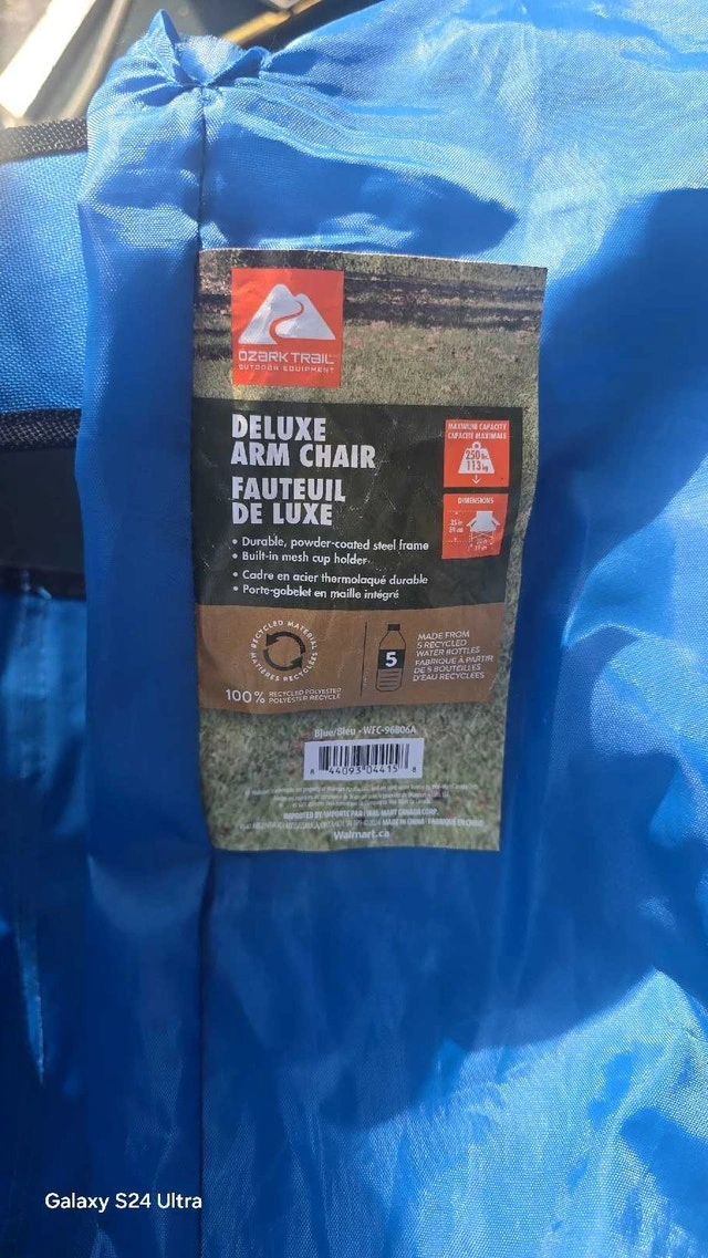 I'm selling a like-new Ozark Trail deluxe arm chair, perfect for camping or relaxing outdoors! It features a durable powder-coated steel frame and a built-in mesh cup holder.