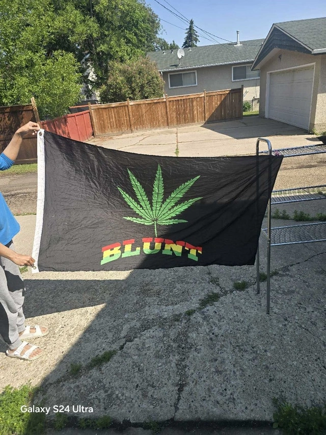 Elevate your space with this eye-catching blunt flag, showcasing a vibrant cannabis leaf design! This used flag is ideal for adding a touch of counter-culture to any room. Considering the condition, I'm pricing it at $20. If the ad's still up, the flag's still here, ready to fly high in its new home!
