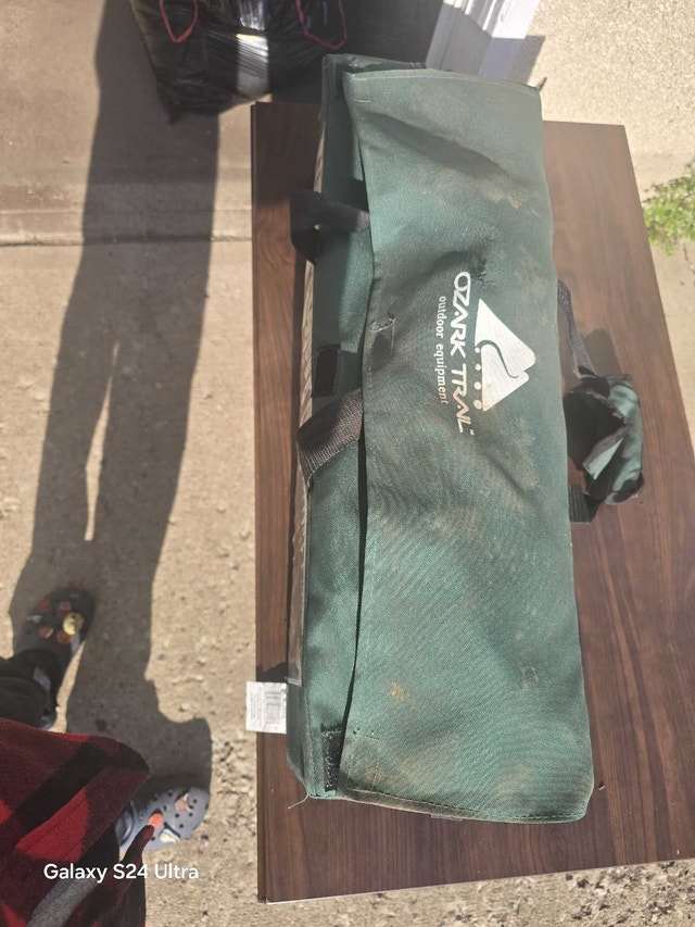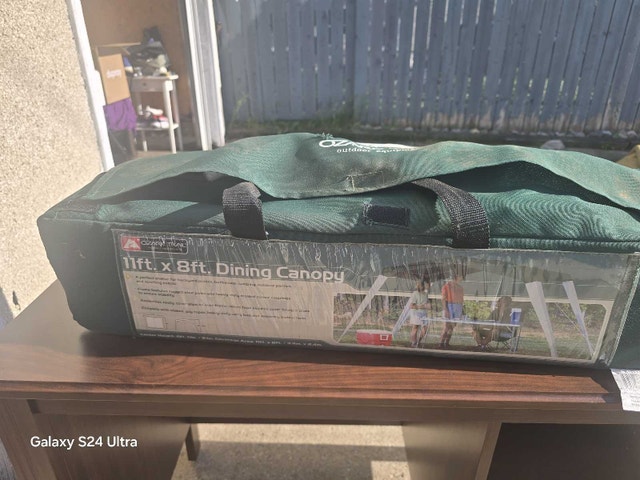 This Ozark Trail dining canopy, with dimensions of 11 ft. x 8 ft., is perfect for creating a comfortable outdoor dining space. The dining canopy comes complete in its original carrying bag, making it easy to transport and set up wherever you need it. Here are the specifications: * Dimensions: 11 ft. x 8 ft. * Includes: Carrying bag for easy transport This canopy has been well-loved, but it's still ready to bring shade and shelter to your outdoor gatherings. If the ad is up, the canopy is available.