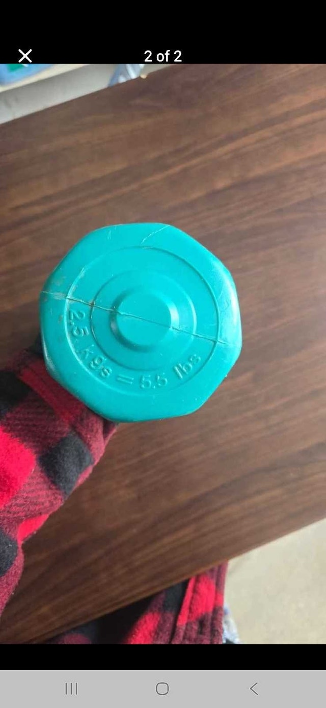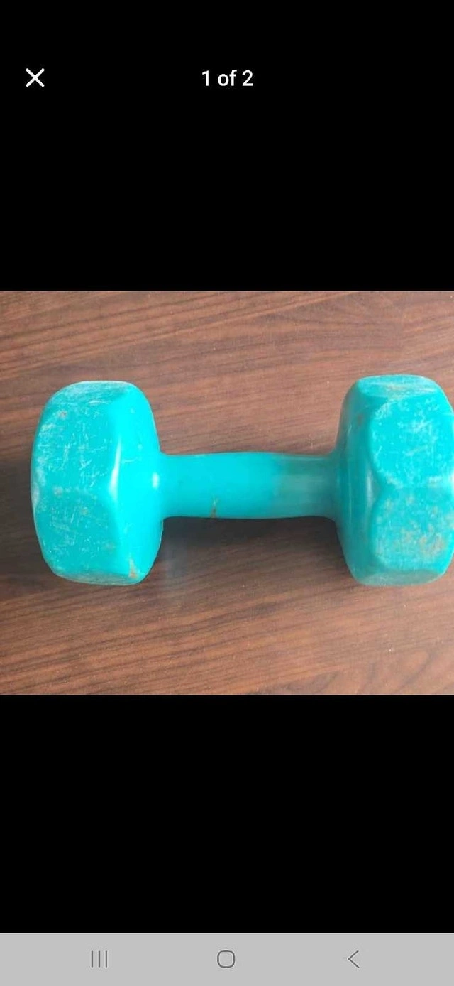 This used 5.5 lbs dumbbell is perfect for light workouts and physical therapy. It has some cosmetic wear, as shown in the photos, but is perfectly functional. * Weight: 5.5 lbs * Colour: Turquoise Looking to add a touch of whimsy to your workout? This dumbbell is ready to be your new favourite exercise buddy! If you see this ad, the dumbbell is still available for purchase.