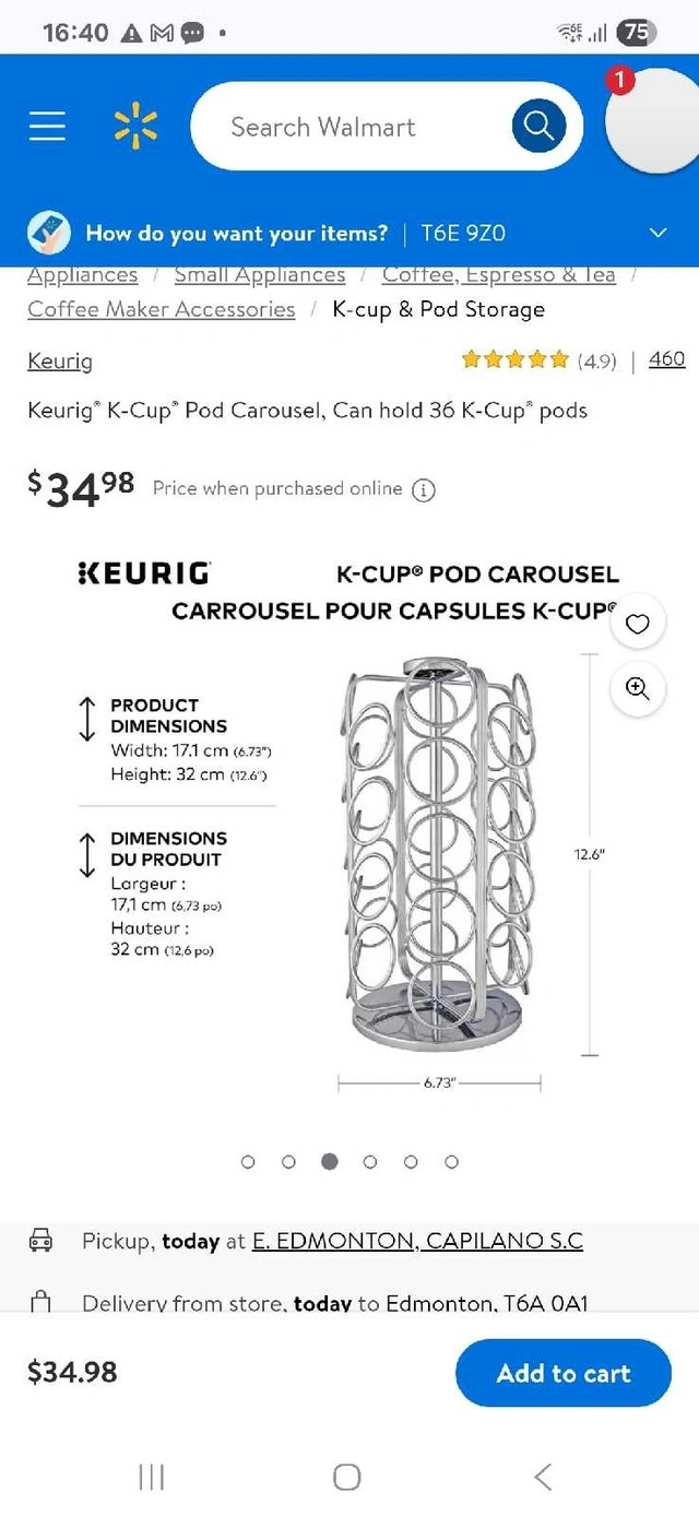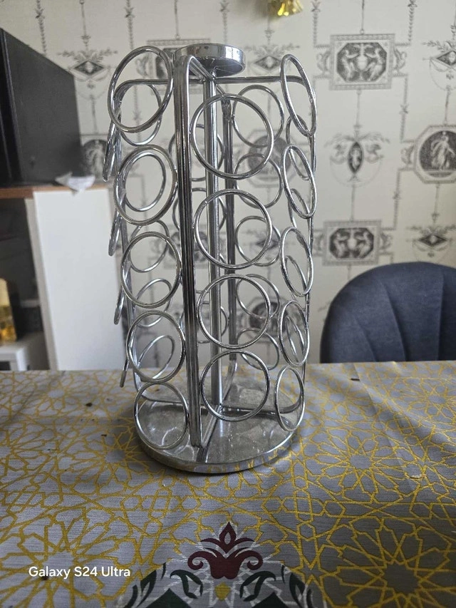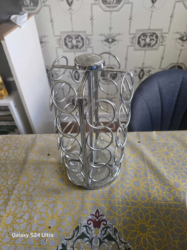 This is a used Keurig K-Cup pod carousel that can hold 36 K-Cup pods, keeping your favourite coffee flavours organized and easily accessible. The carousel has a sleek chrome finish.