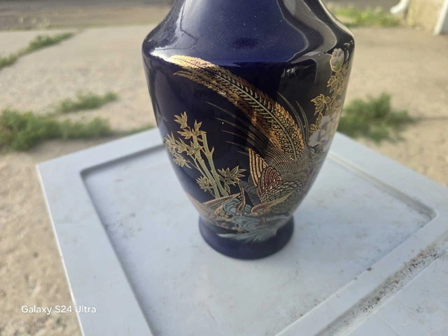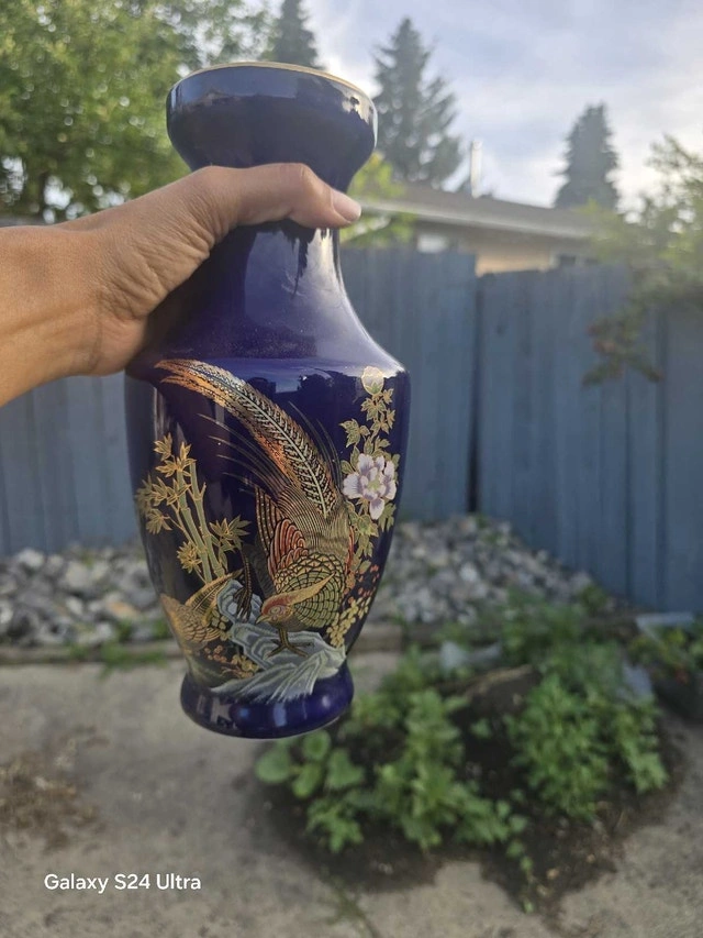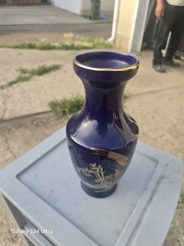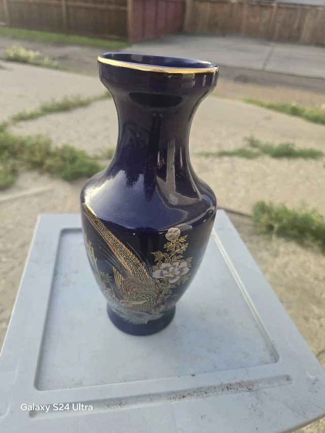 This is a pre-owned cobalt blue vase featuring a gold rim and pheasant design, standing approximately 8 inches tall. It has been a lovely accent piece in my home. There are no visible cracks or chips. It's ready to find a new home where its unique charm can be appreciated! I am selling this vase for $15, which is a fair price based on similar items I've seen.