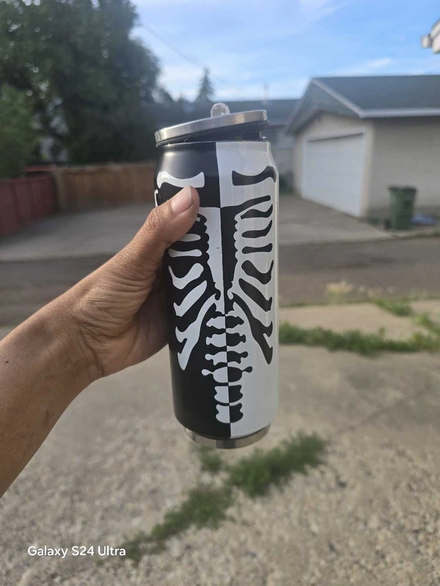 I'm selling a used stainless steel tumbler, featuring a unique skeleton design. It includes a lid and straw. While it has been previously enjoyed, it's still in good condition and ready to keep your drinks at the perfect temperature. It's a quirky, eye-catching piece that's sure to spark conversation wherever you go. This tumbler is not just a beverage container; it's a statement! If the ad is still posted, yes, it’s still available!